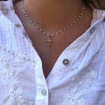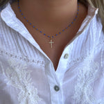 Collier à fines perles colorées ajustable avec un pendentif Croix orné de strass.