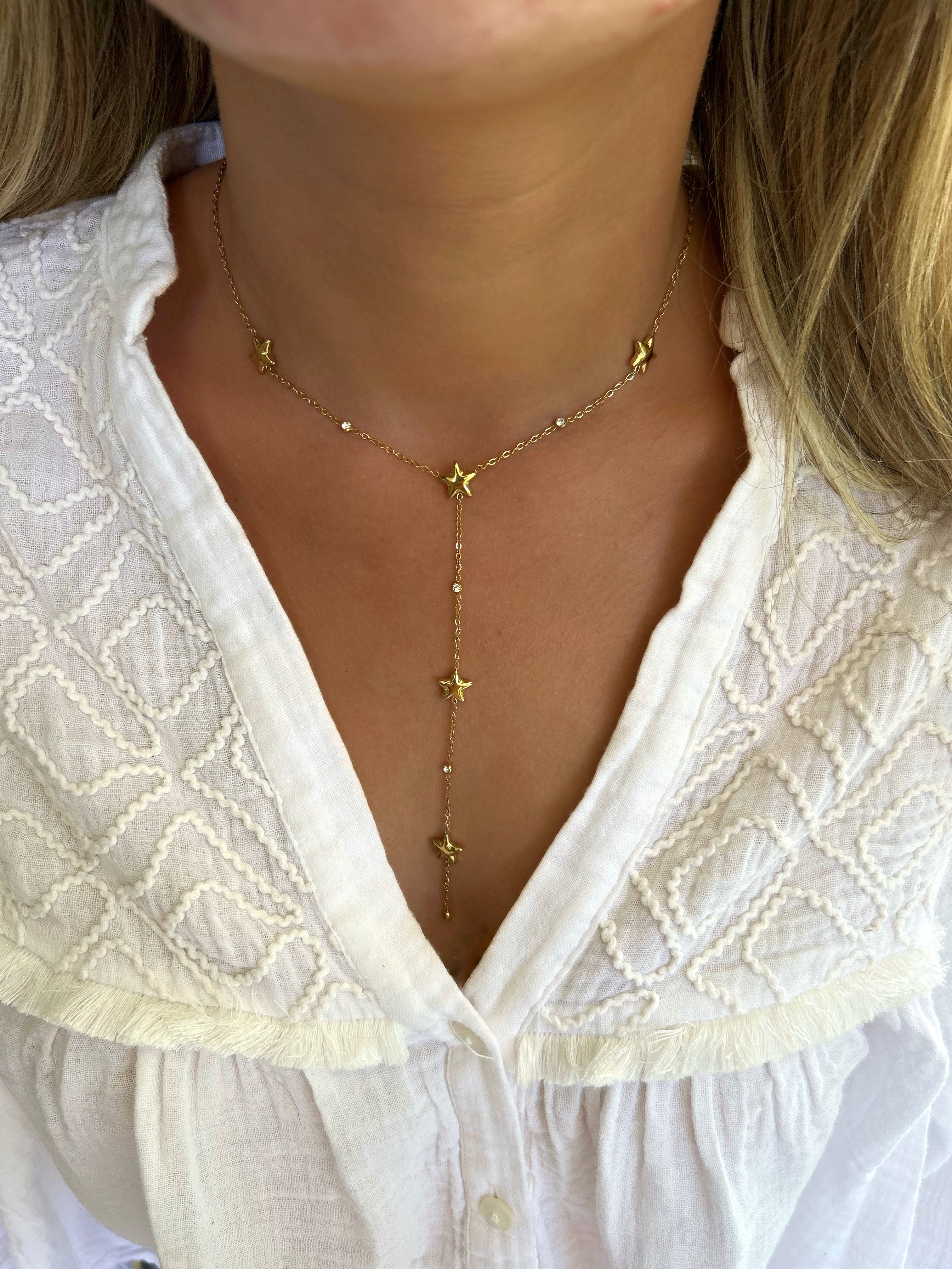 Collier Y en fines chaînes ajustables avec deux pendentifs, des étoiles et des strass.