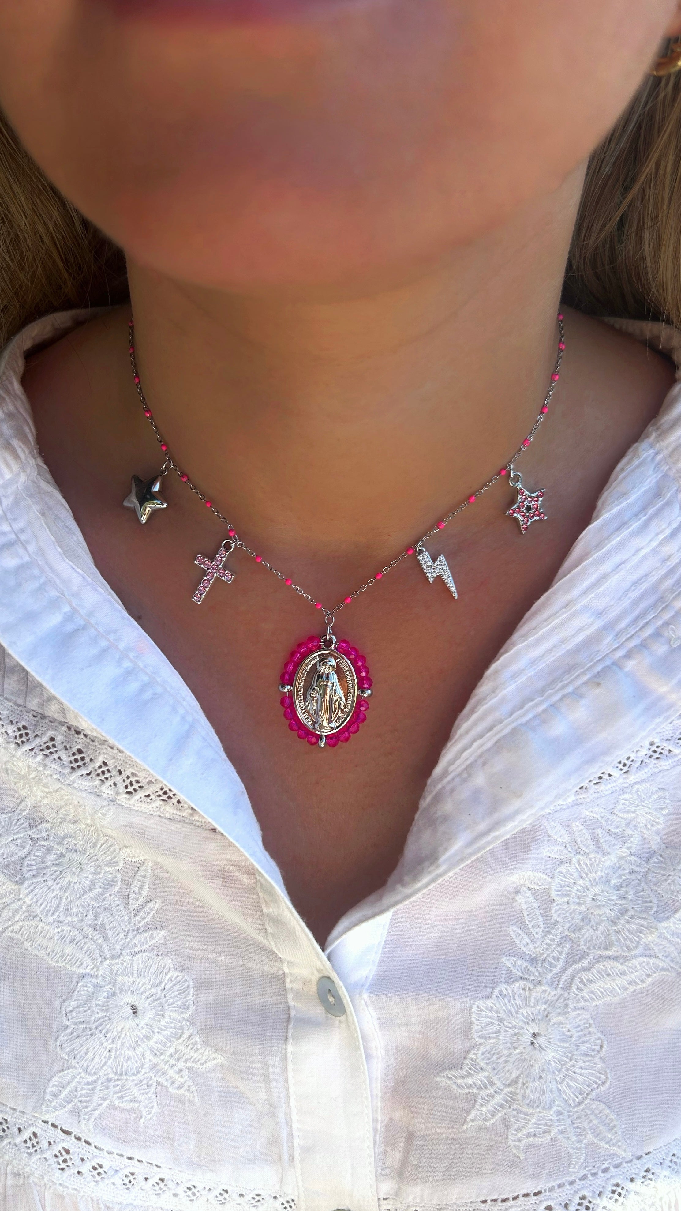 Collier à fines perles roses ajustable, composée de 5 charms de la collection Croyance.