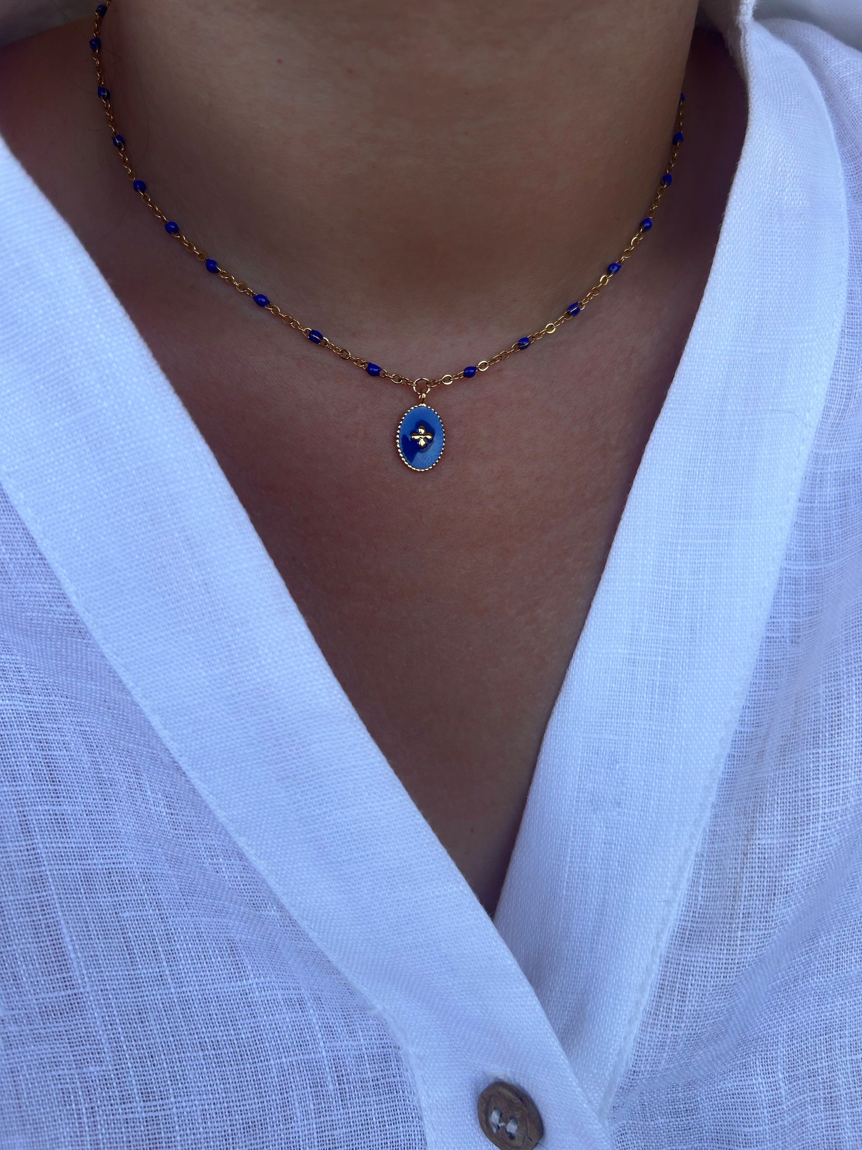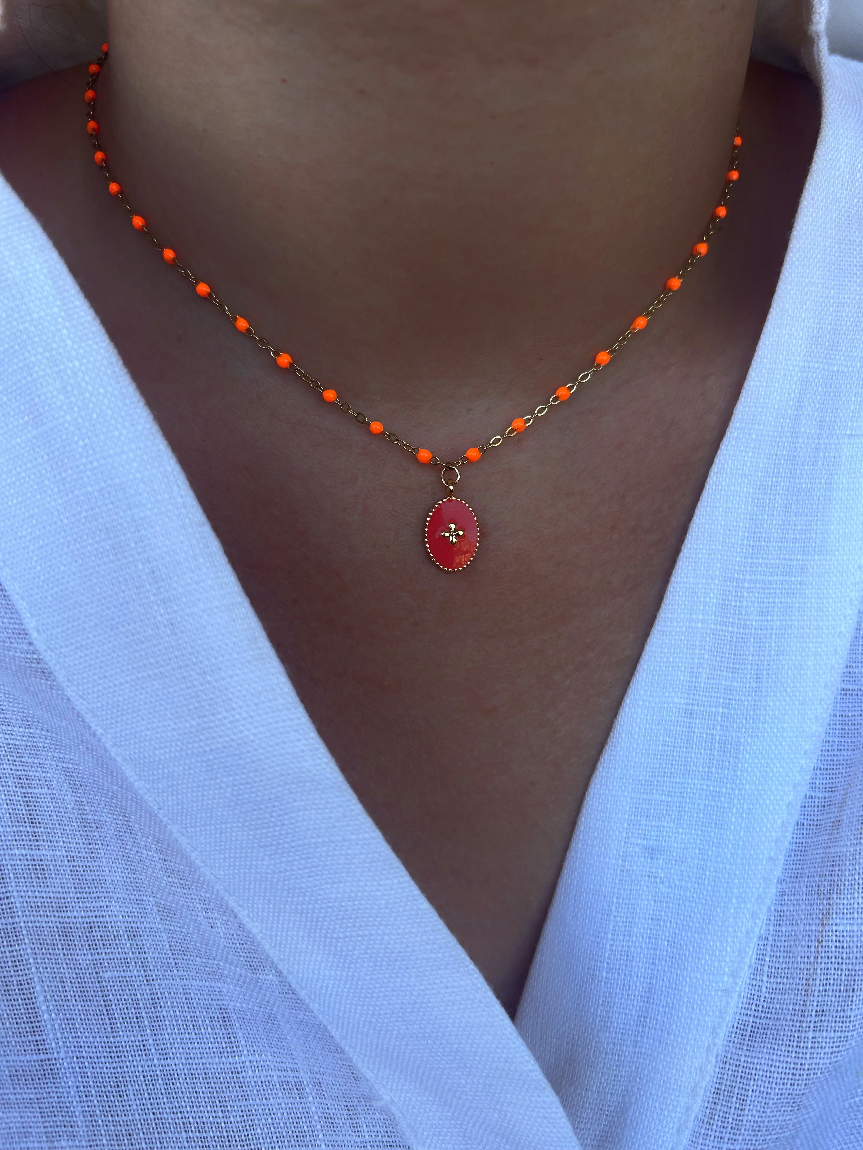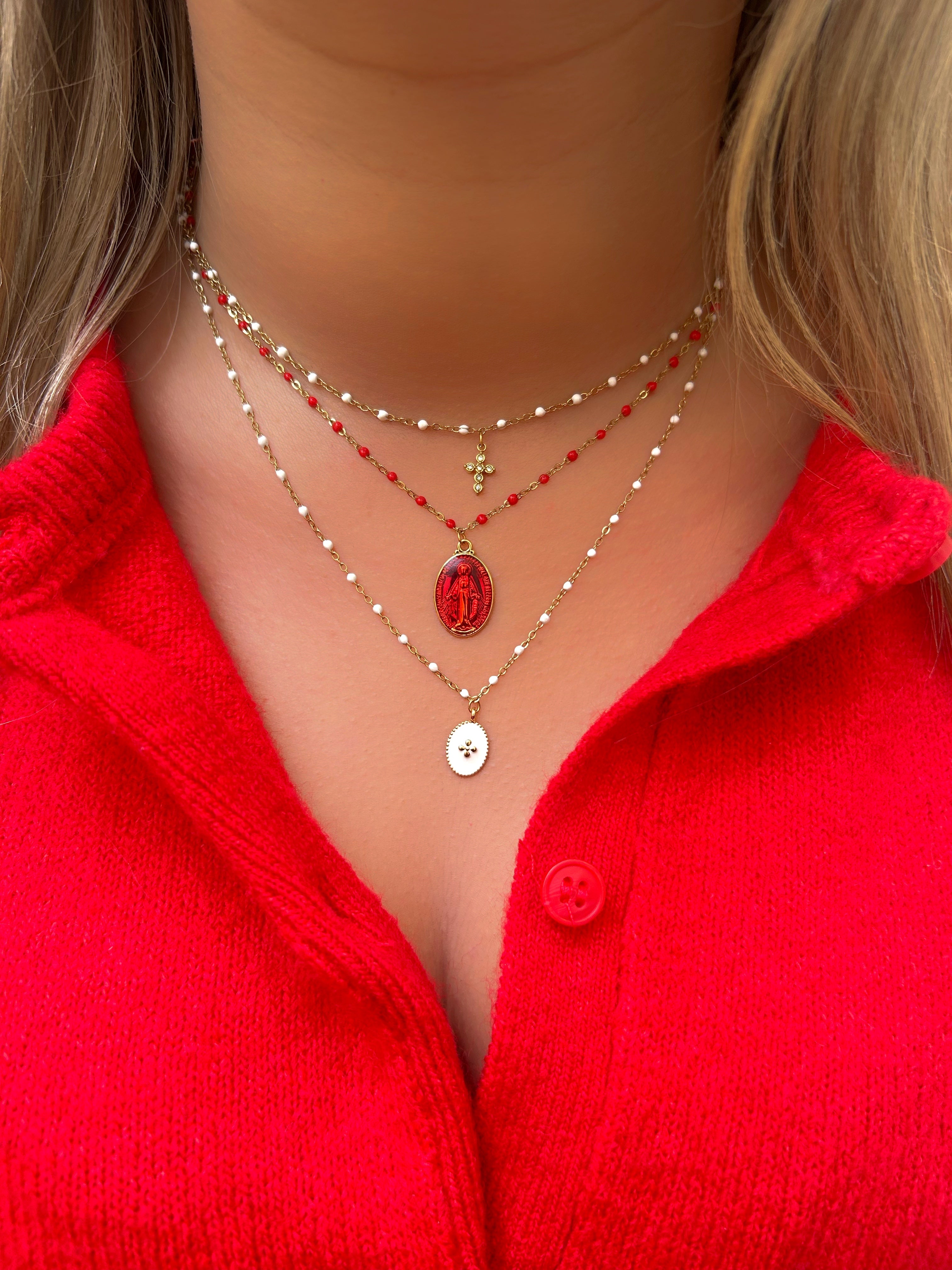 Collier à fines perles colorées ajustable avec une médaille Croix.