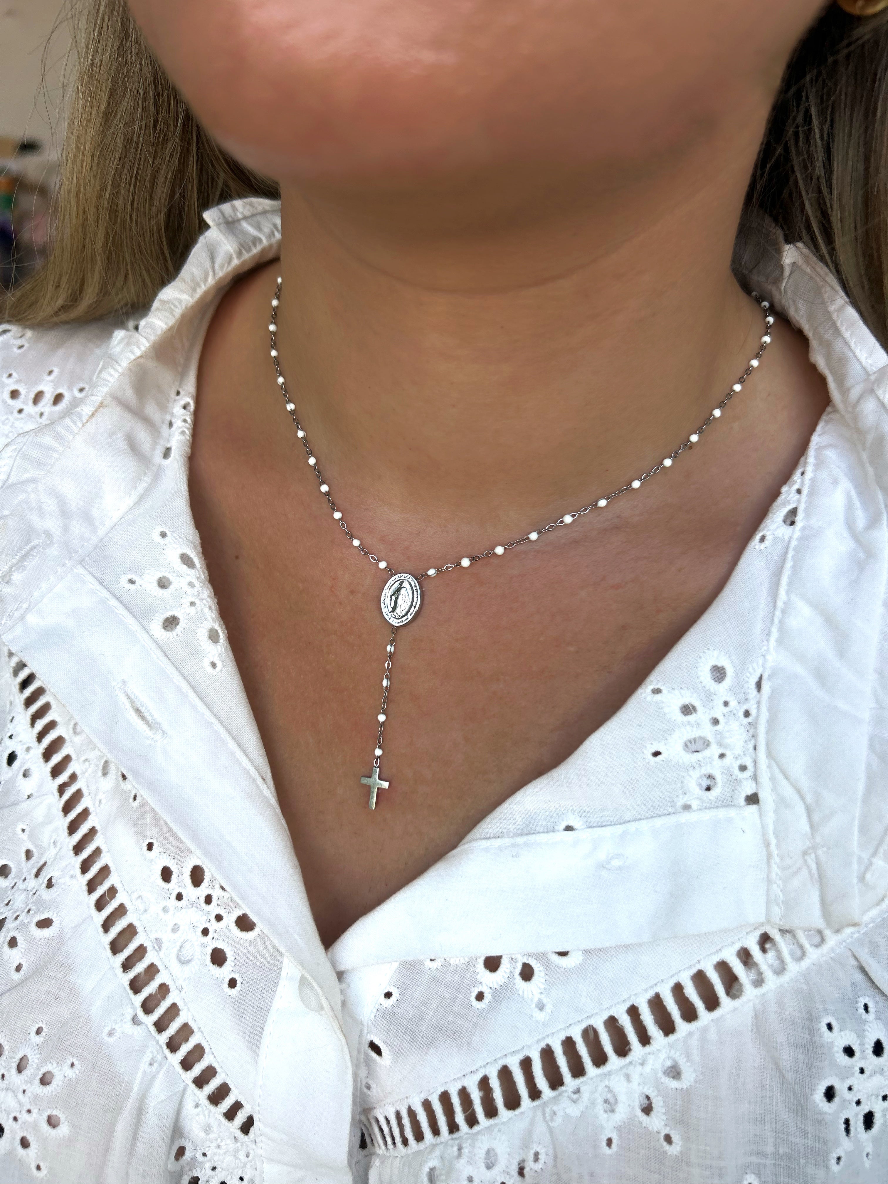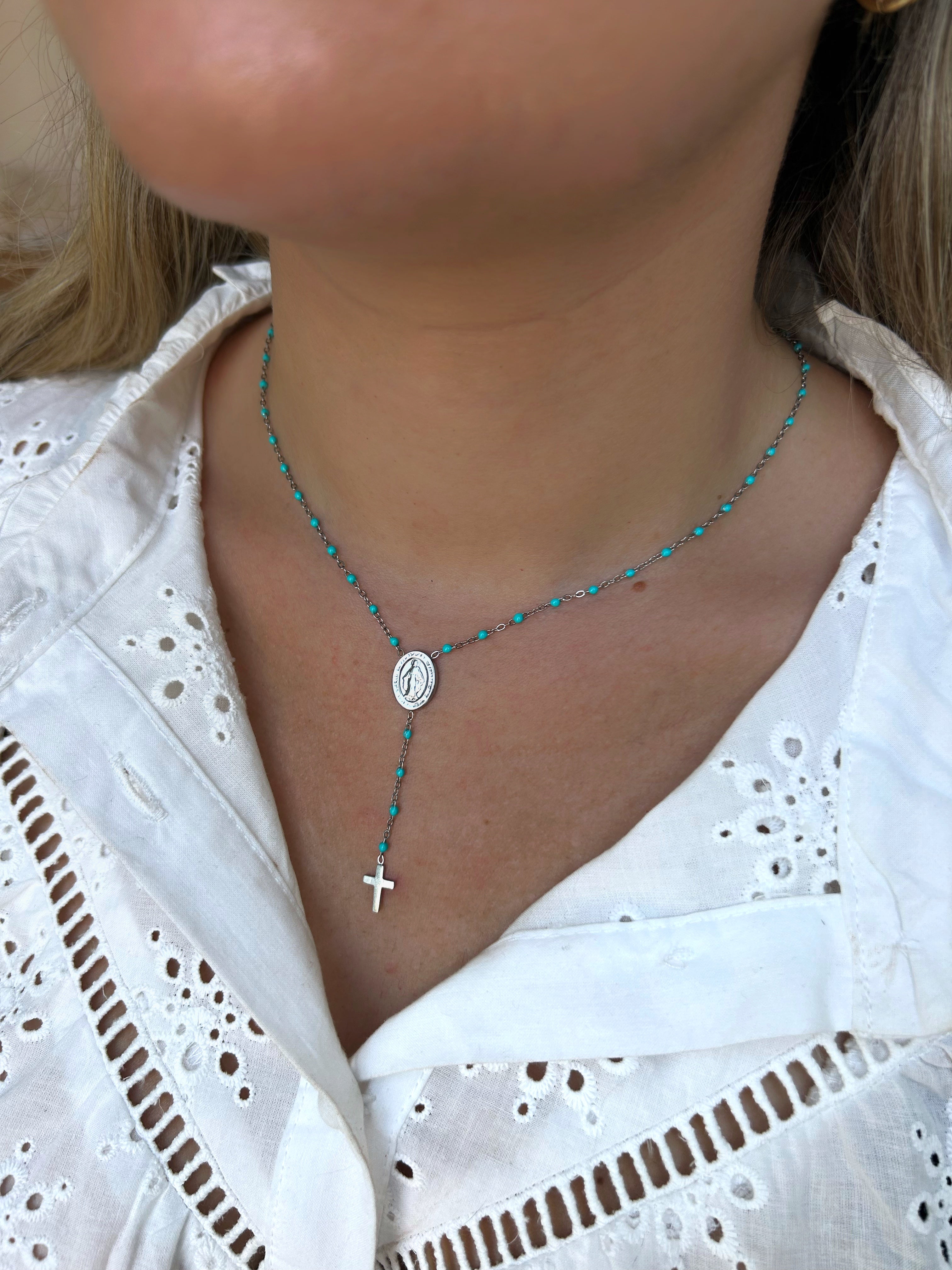 Collier Y à fines perles colorées ajustable avec deux pendentifs, une Médaille vierge et une Croix.