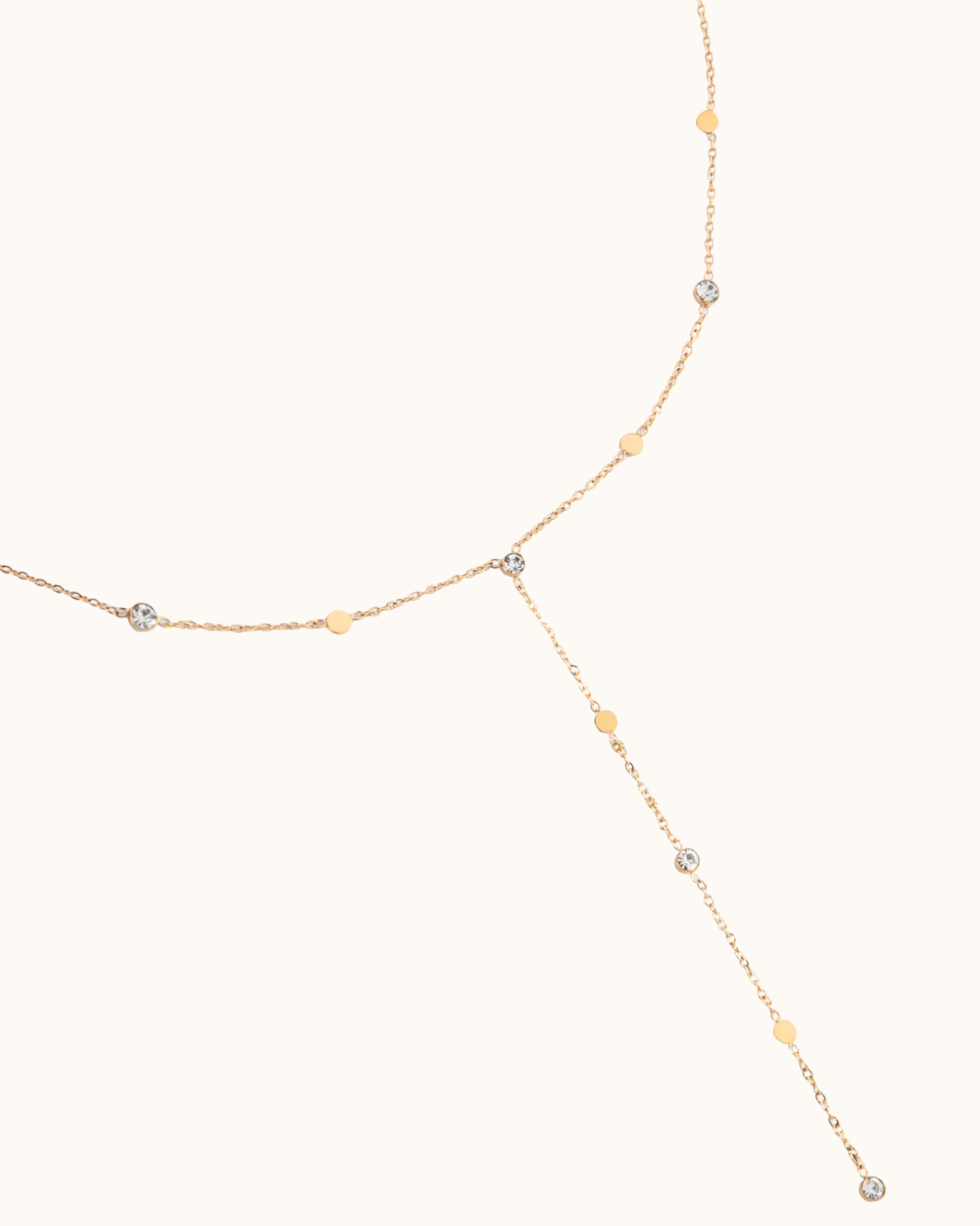 Collier Y en fine chaîne ajustable orné de pastilles et de strass.