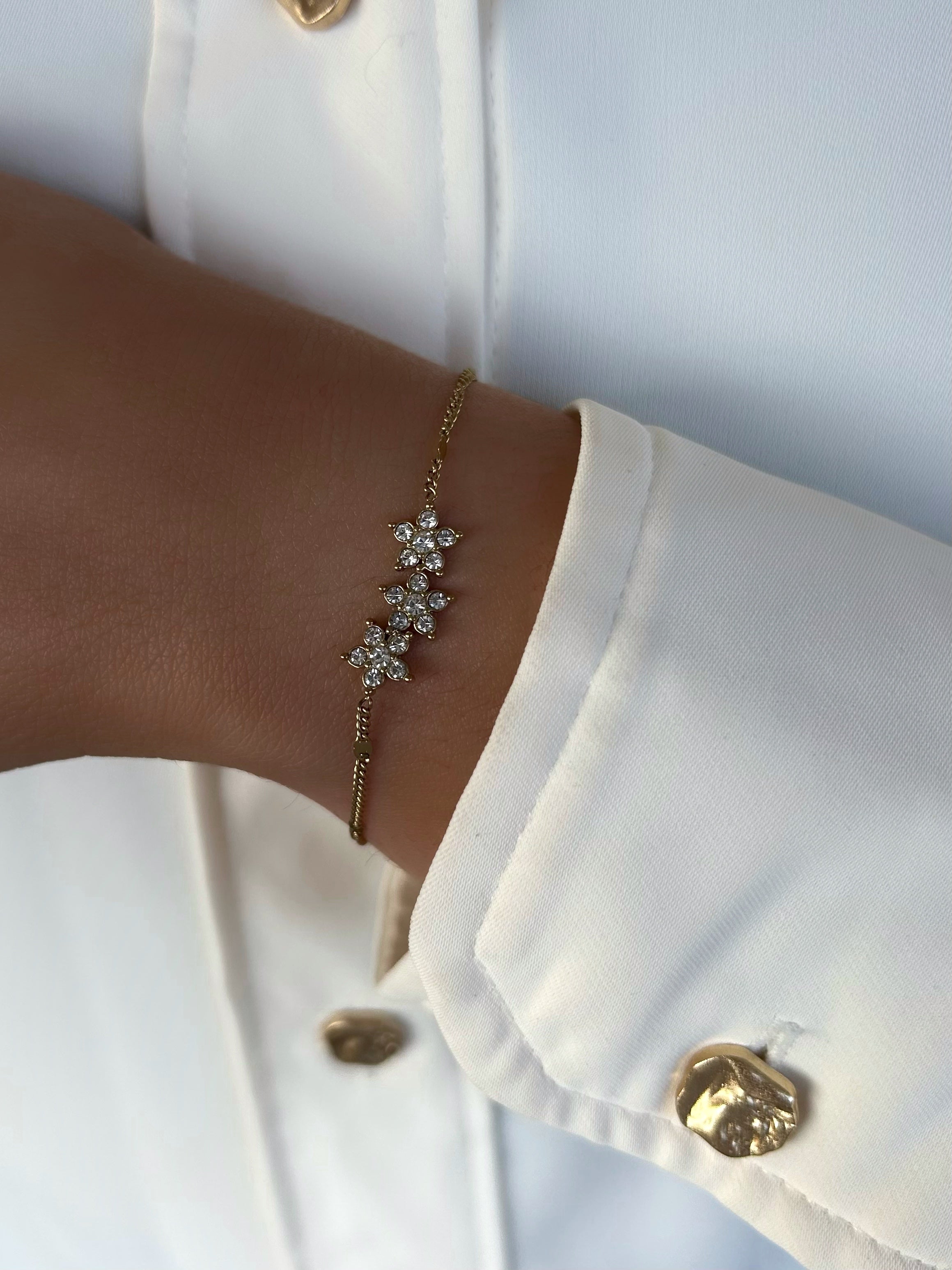 Bracelet en fines chaînes ajustable orné de fleur à strass.