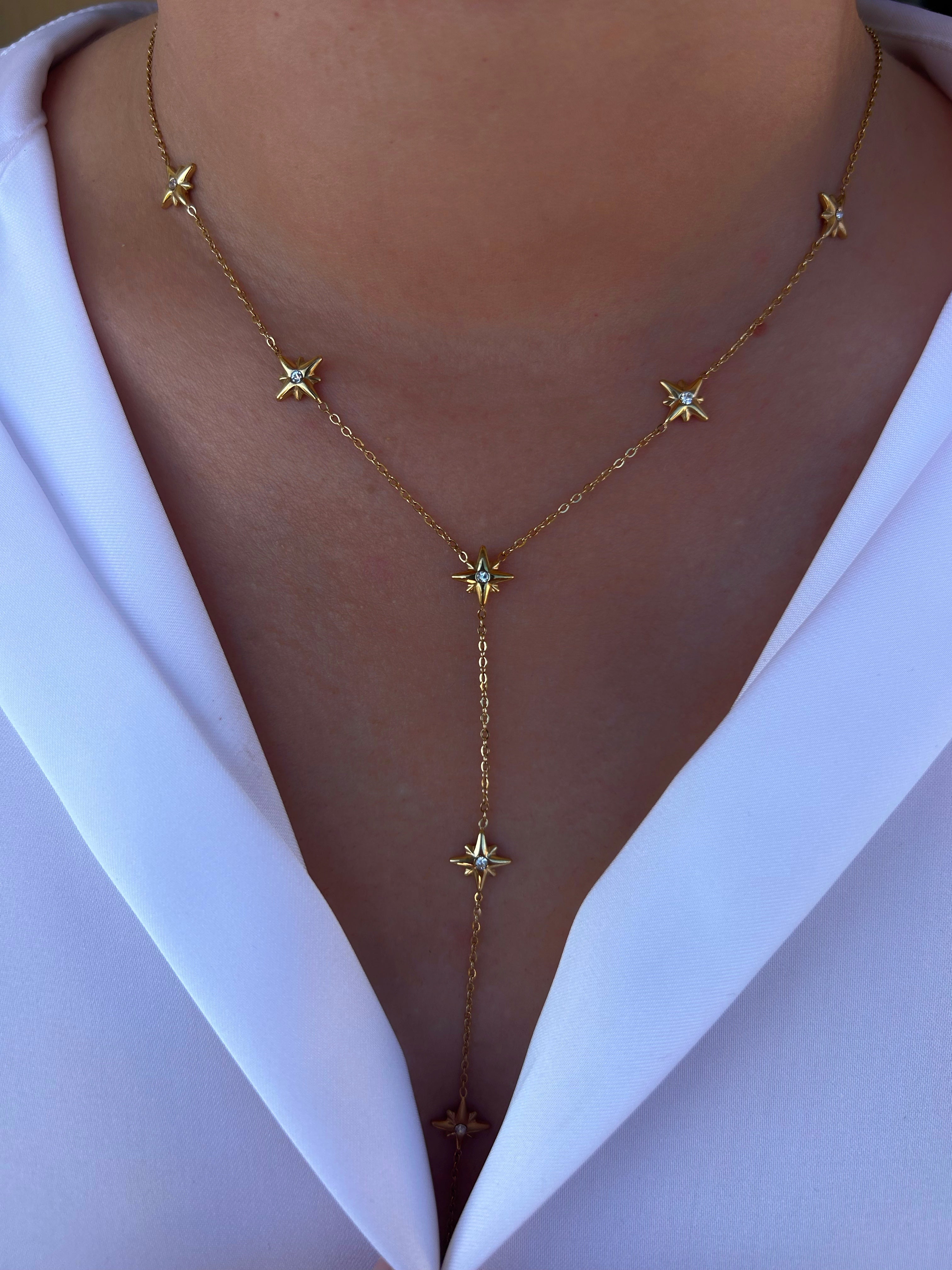Collier Y en fines chaînes ajustables avec des pendentifs d'Étoiles ornés de strass.