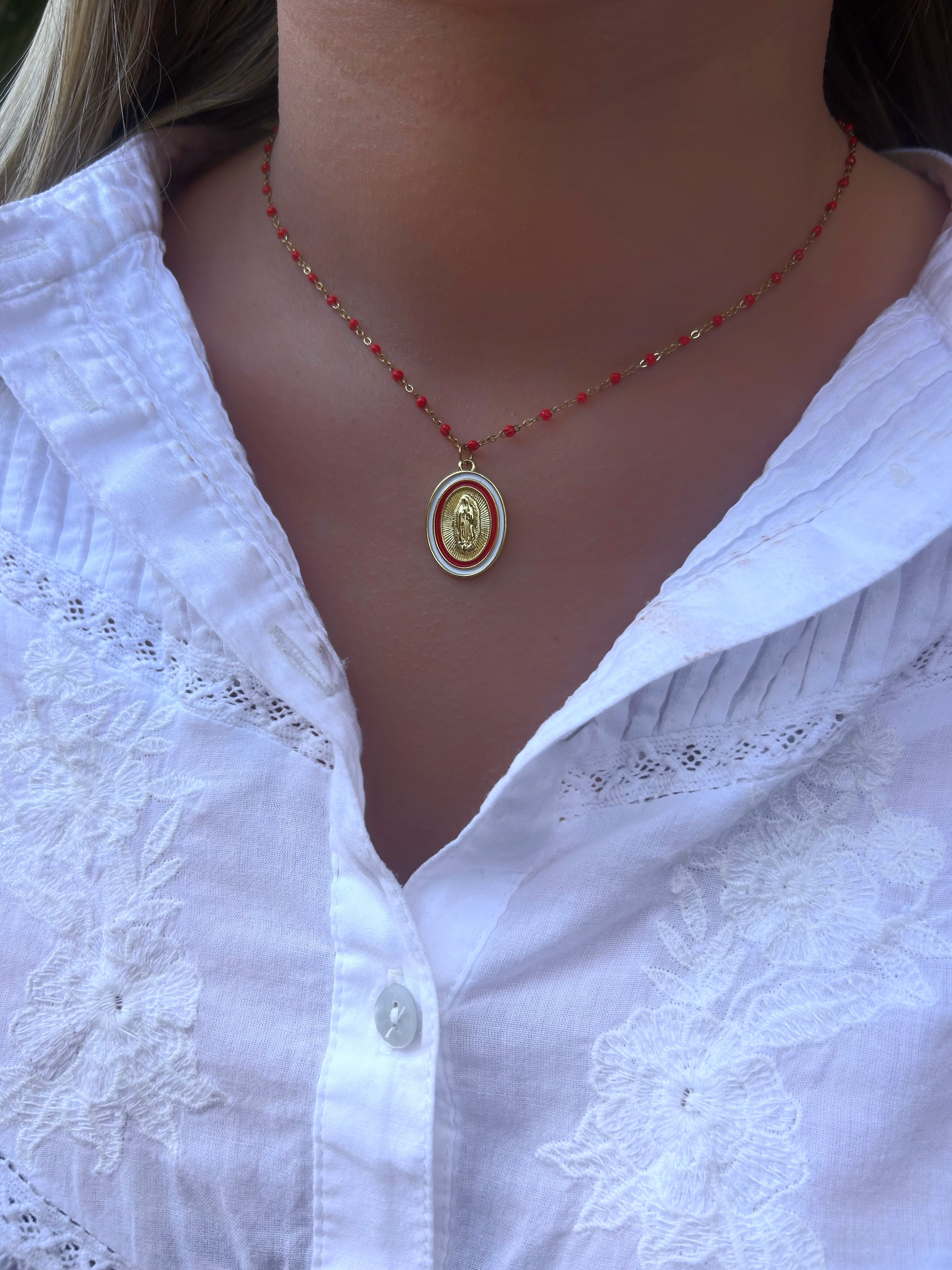 Collier à fines perles rouges ajustable avec un pendentif Vierge.