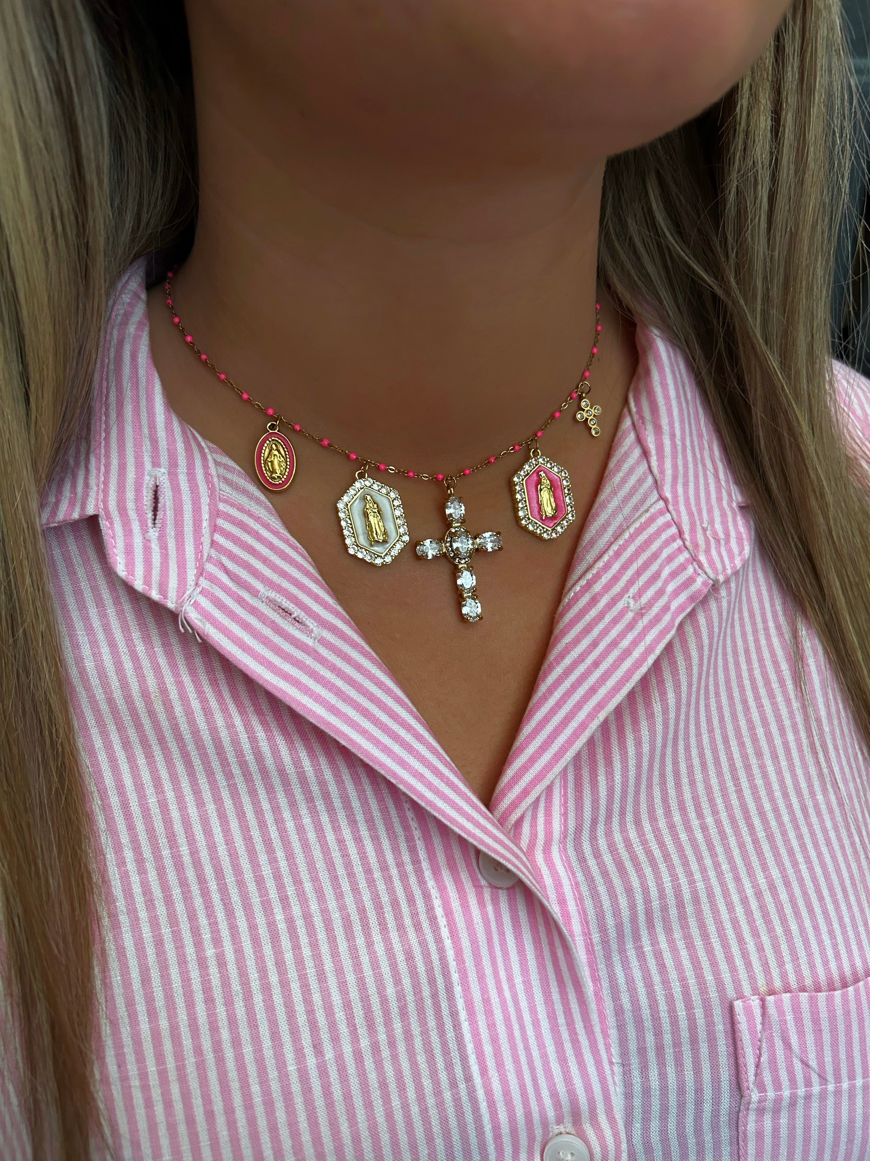 Collier à fines perles roses ajustable, composée de 5 charms de la collection Croyance.
