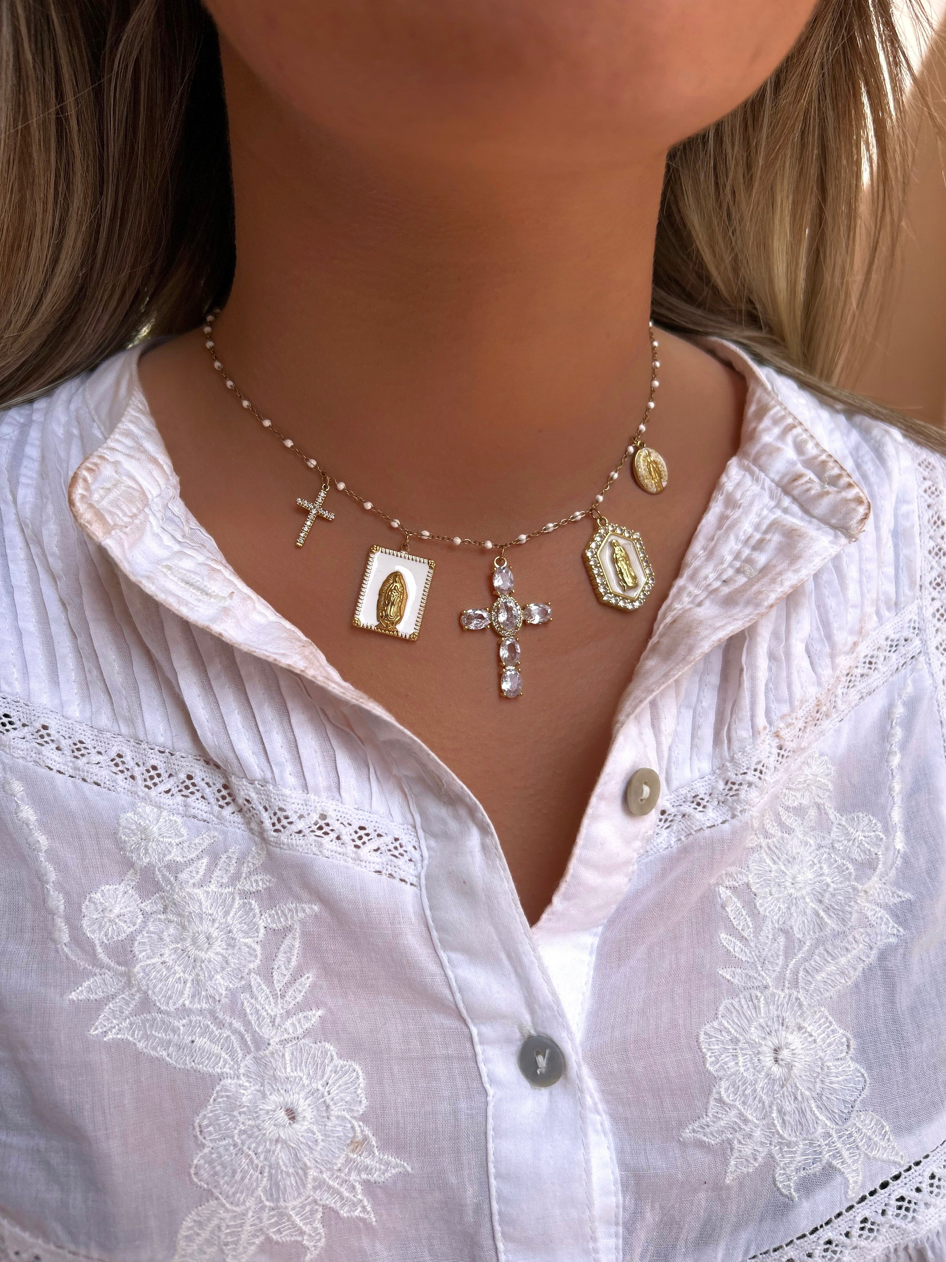 Collier à fines perles blanches ajustable, composée de 5 charms de la collection Croyance.