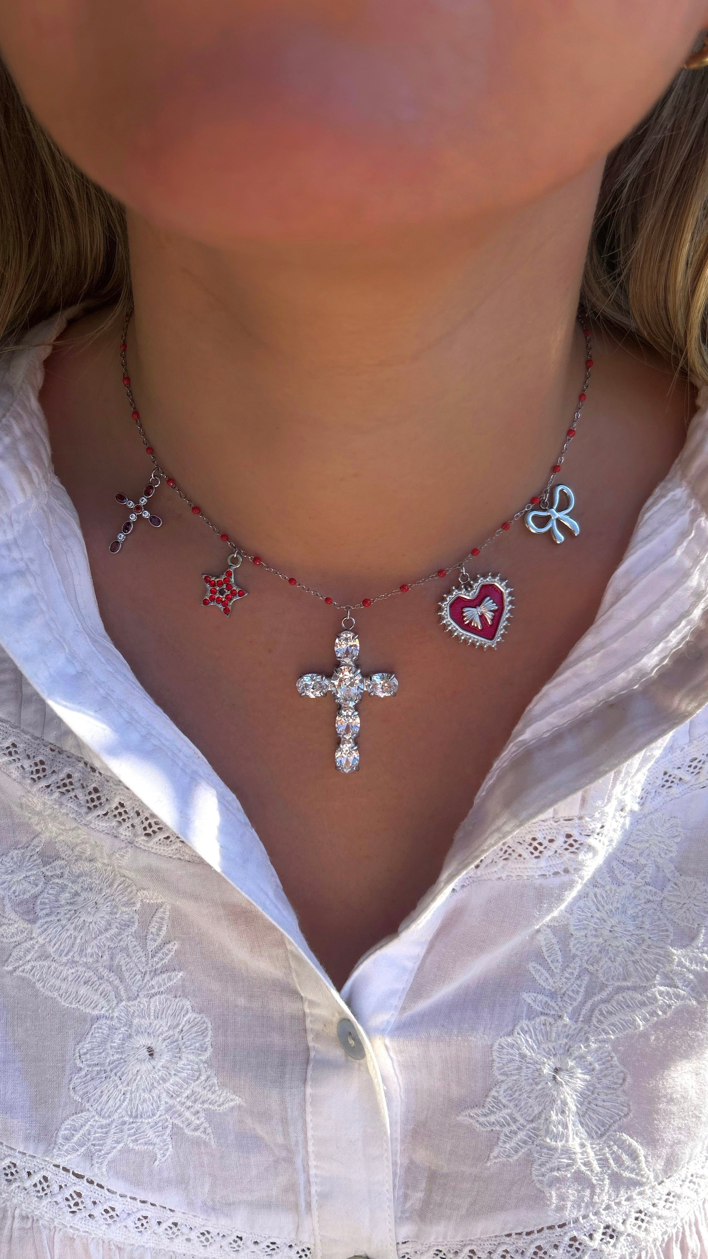 Collier à fines perles rouge ajustable, composée de 5 charms de la collection Croyance.