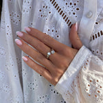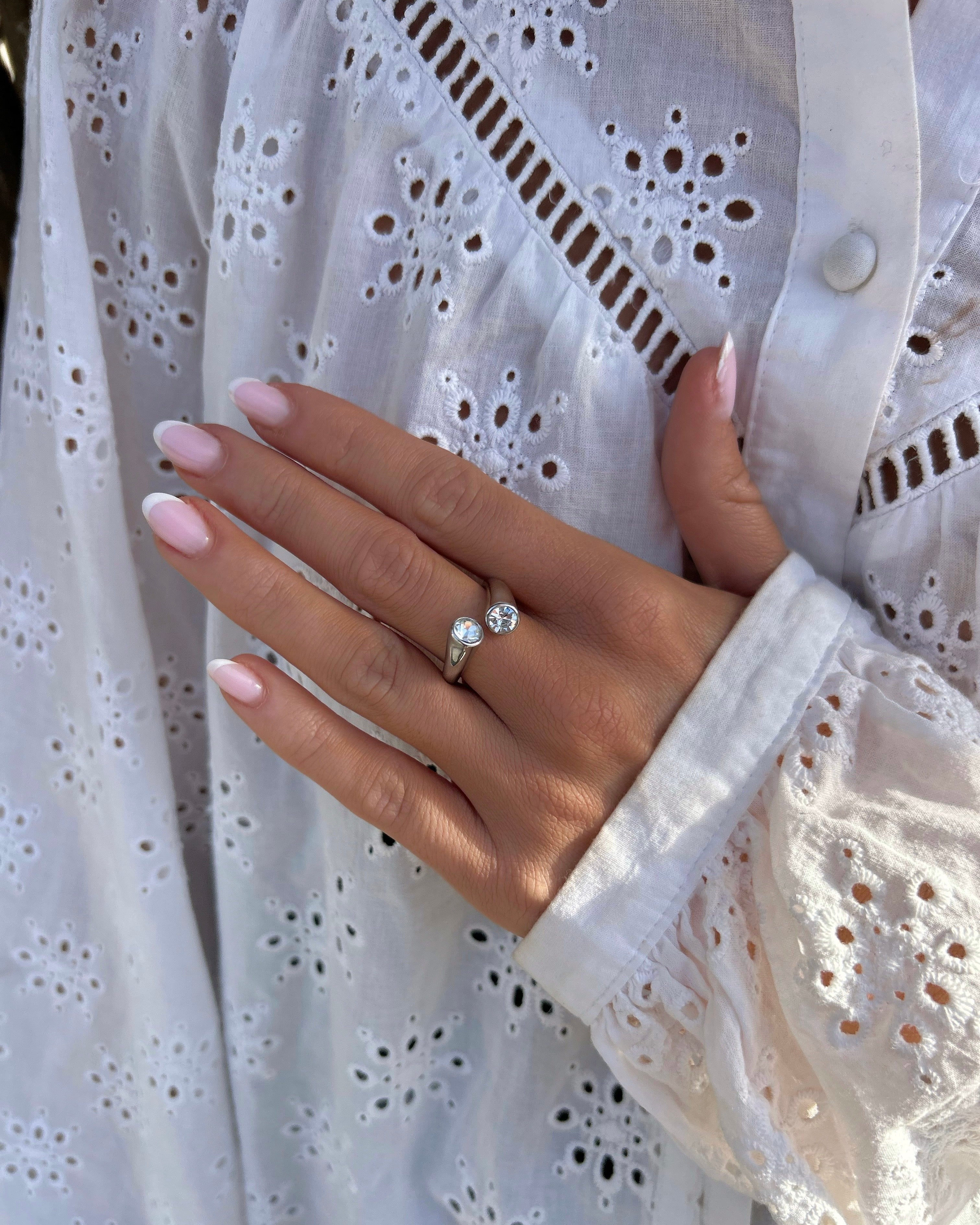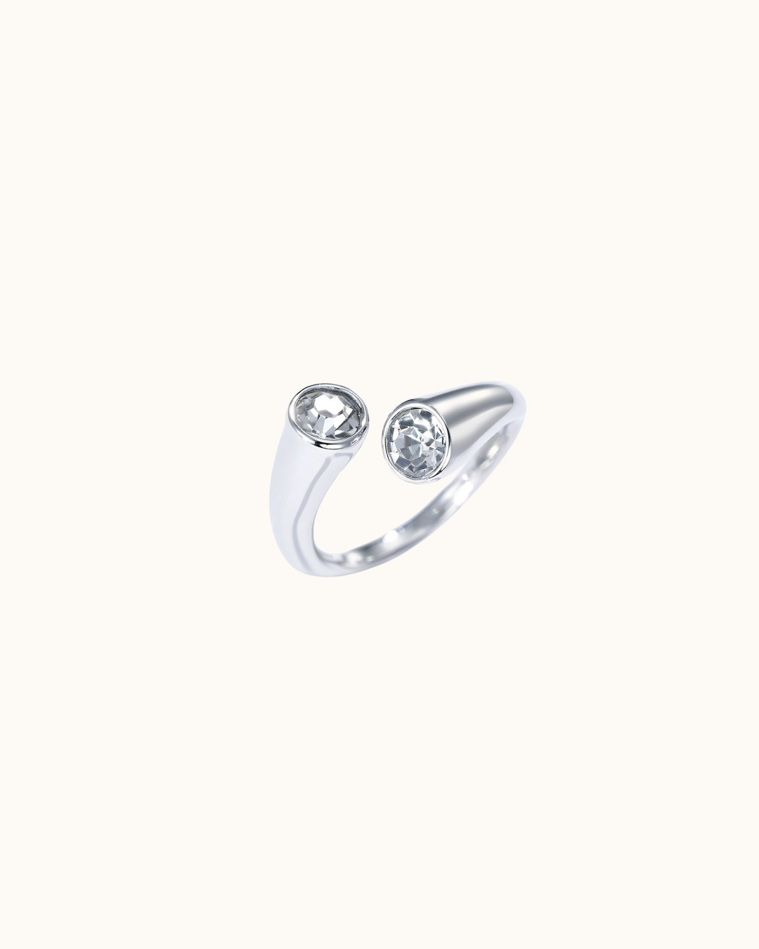 Bague ouverte dorée ornée de deux strass ronds scintillants.