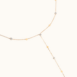 Collier Y en fine chaîne ajustable orné de pastilles et de strass.