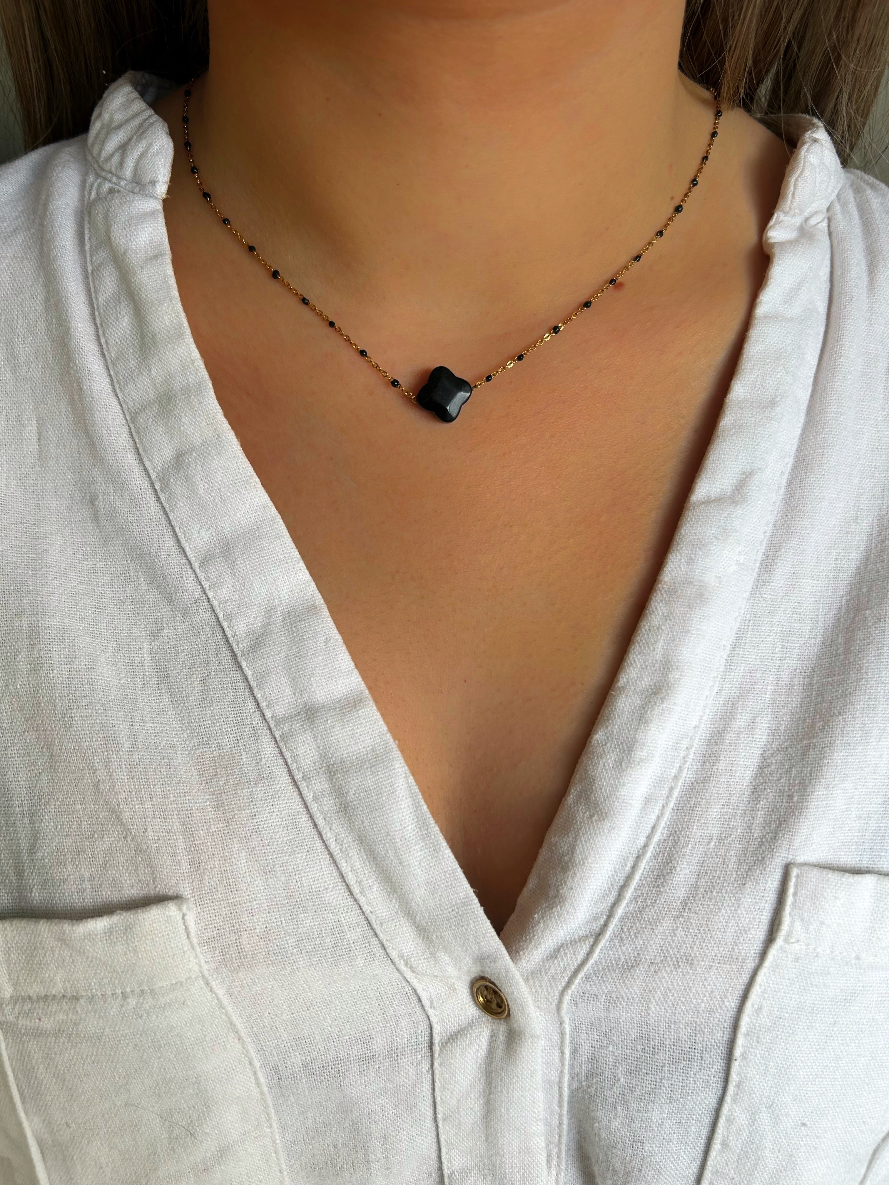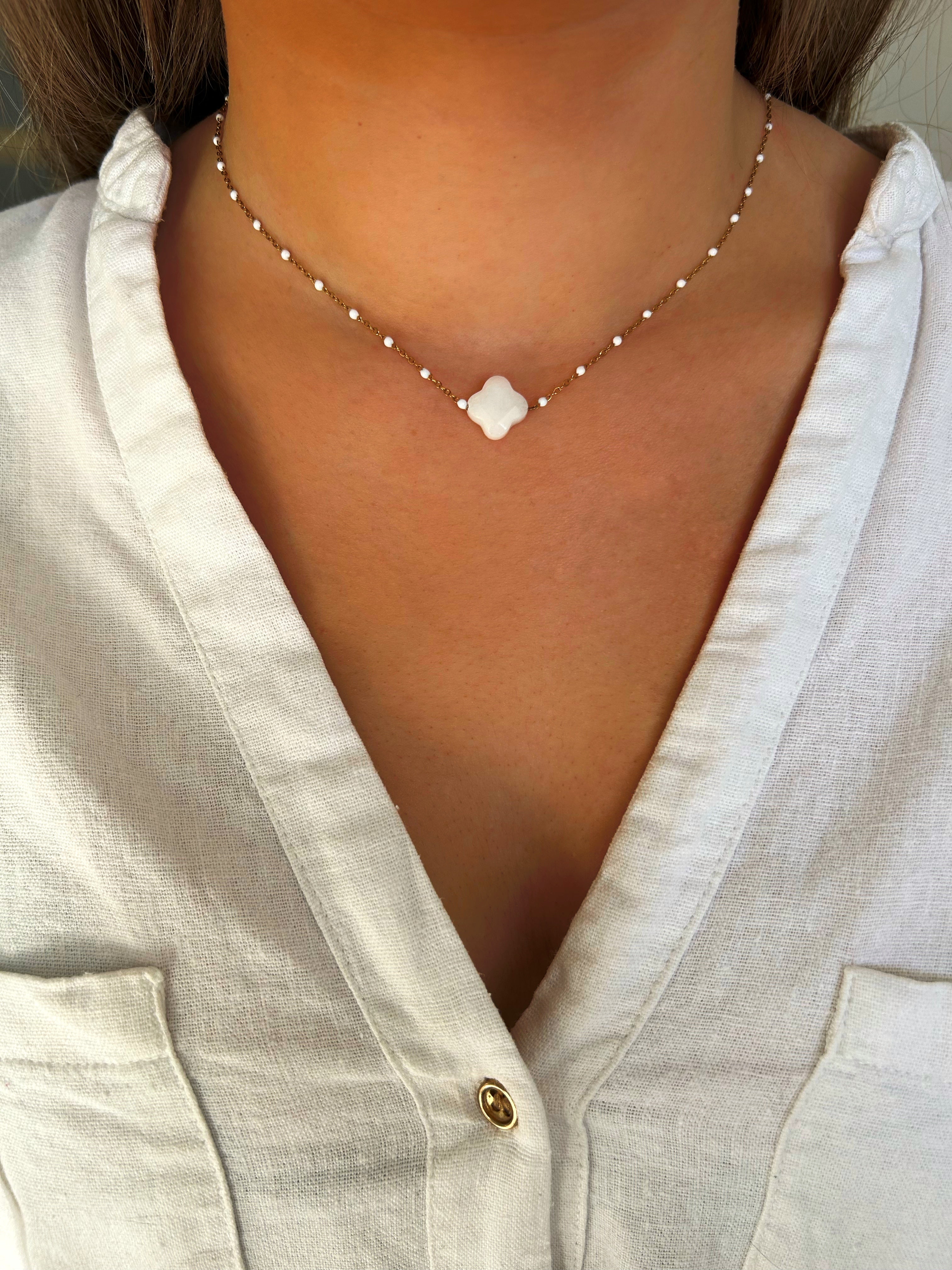 Collier à fines perles colorées ajustable avec un pendentif Trèfle.