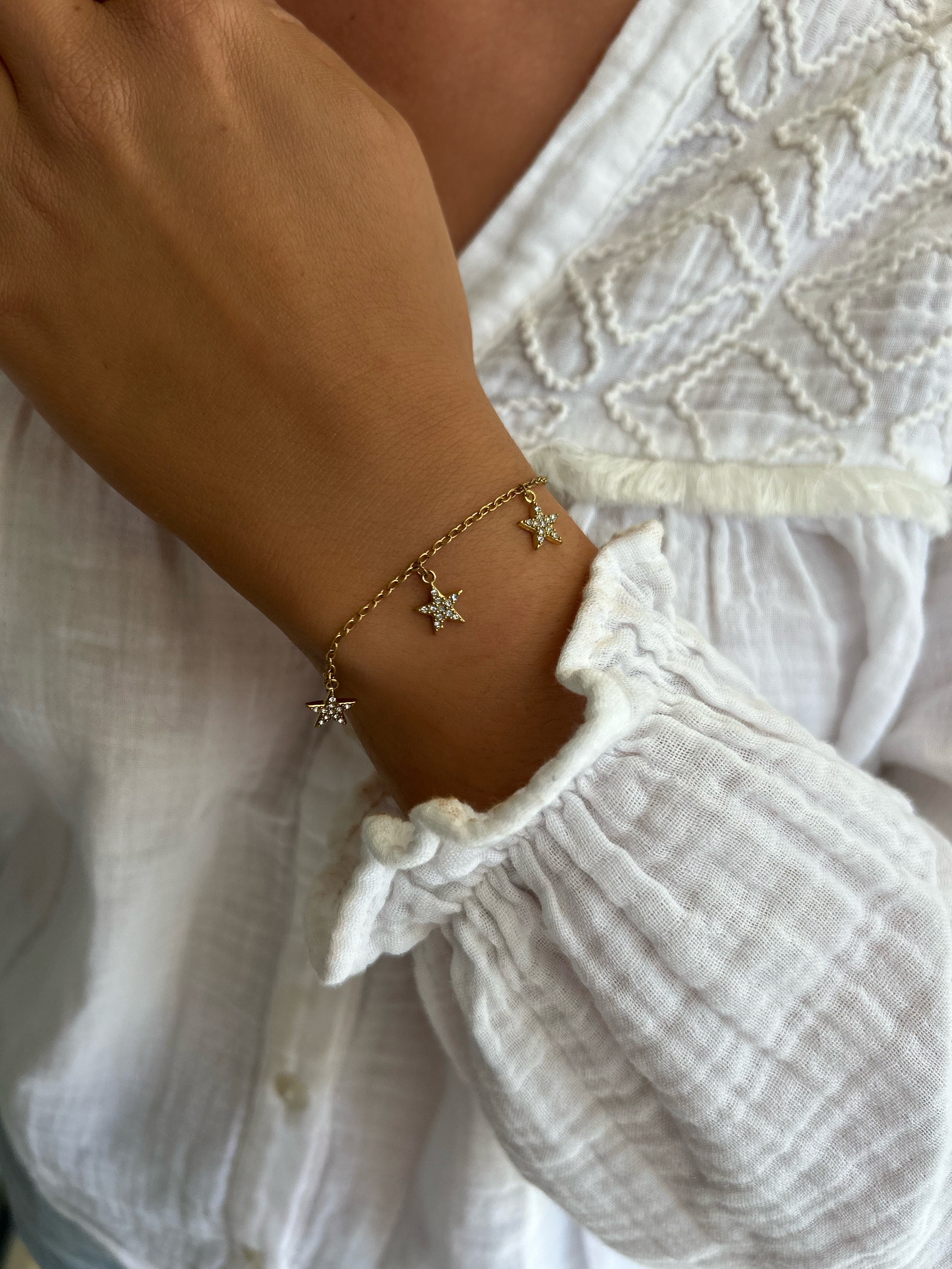 Adjustable fine chain bracelet with rhinestone-adorned stars.