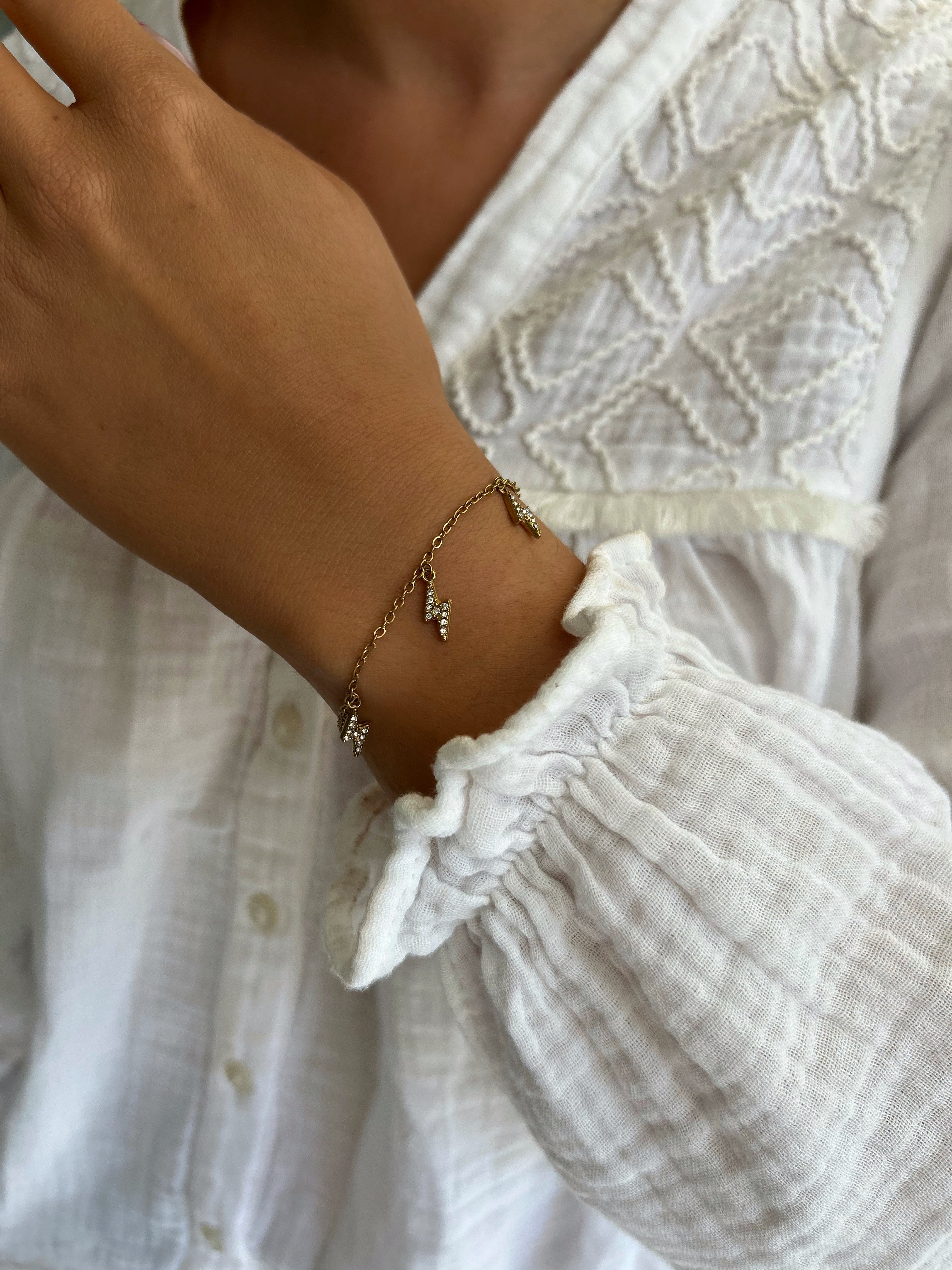 Adjustable fine chain bracelet with Lightning bolt pendants decorated with rhinestones.