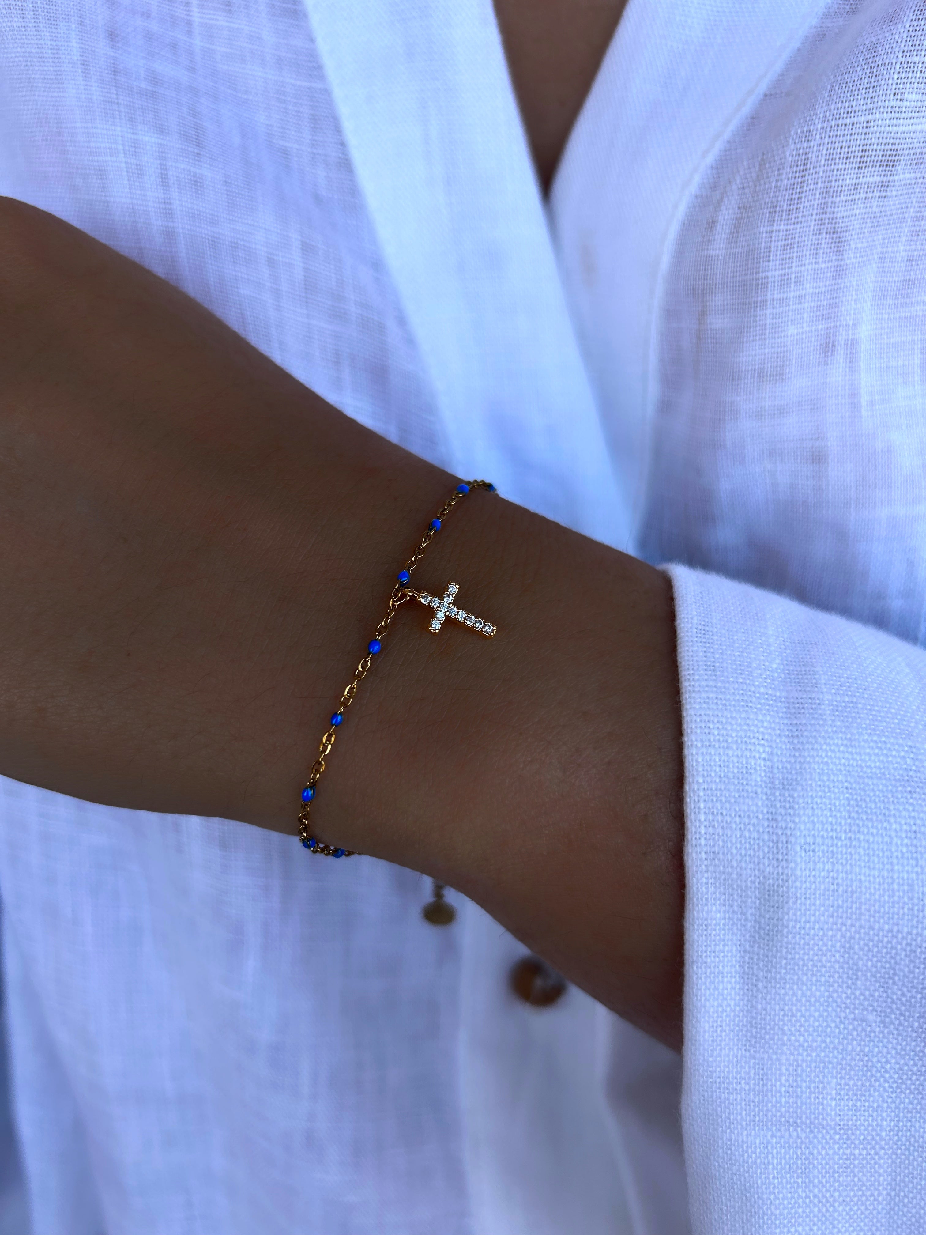 Adjustable fine blue beaded bracelet with a cross pendant decorated with rhinestones.