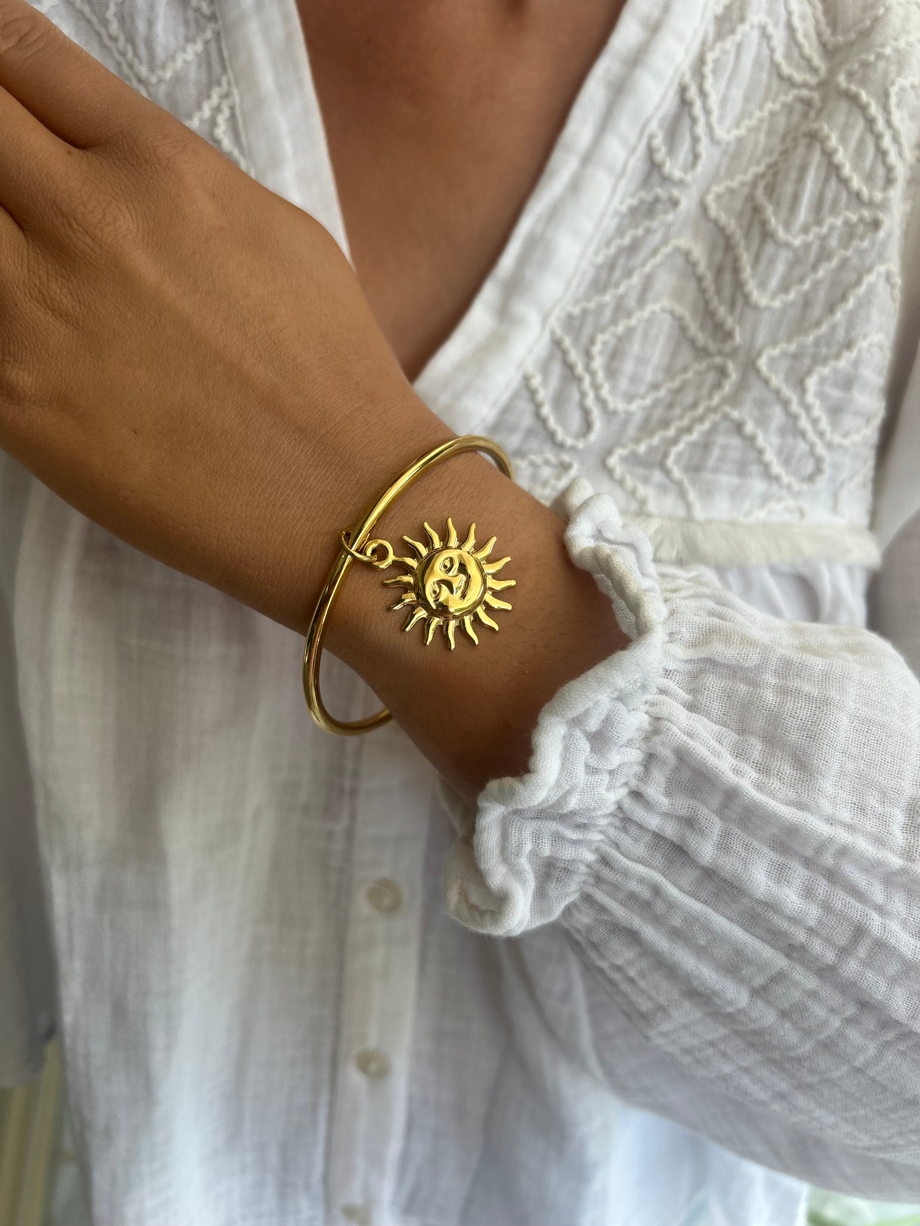 Bangle bracelet with a sun pendant.