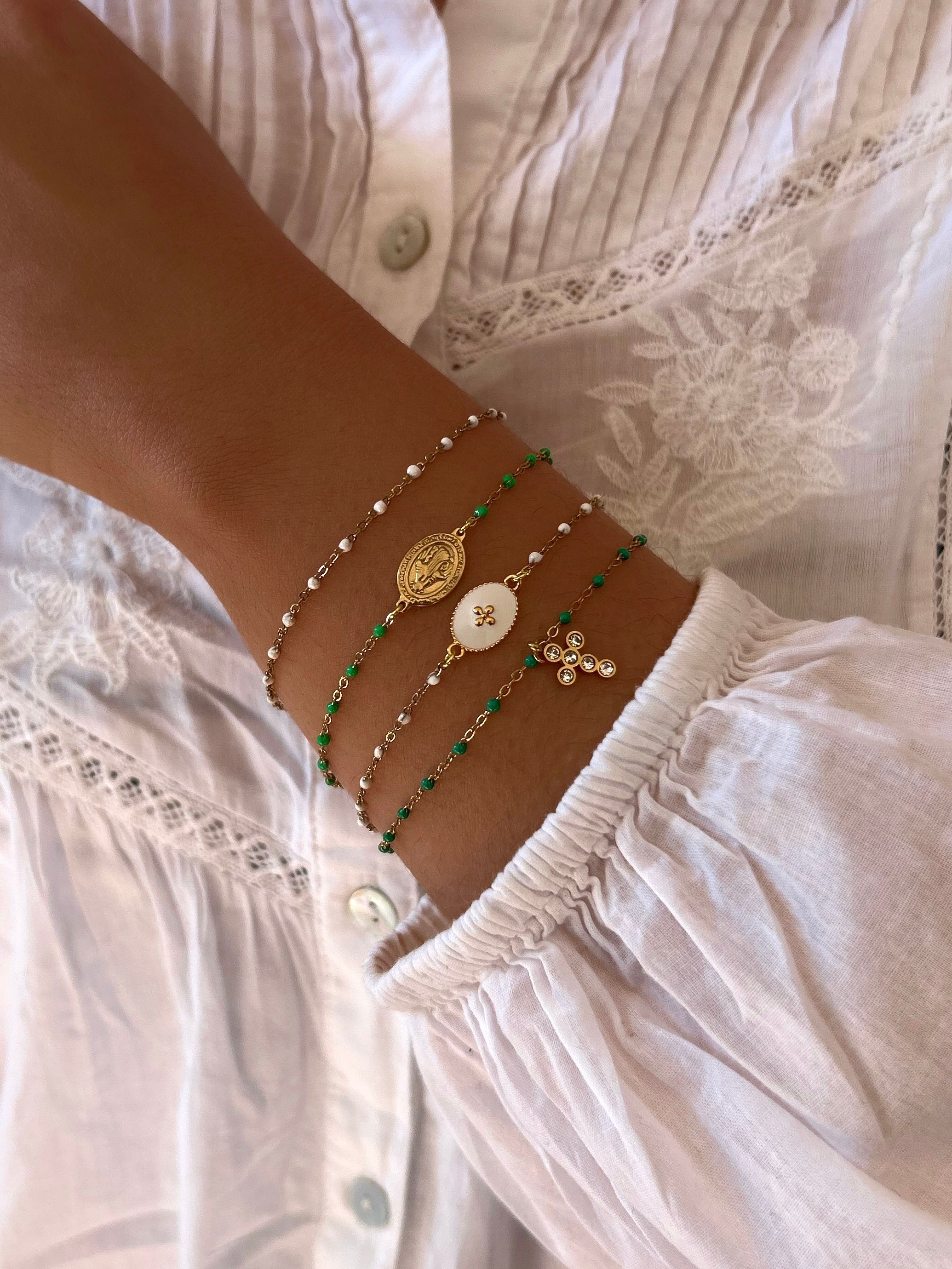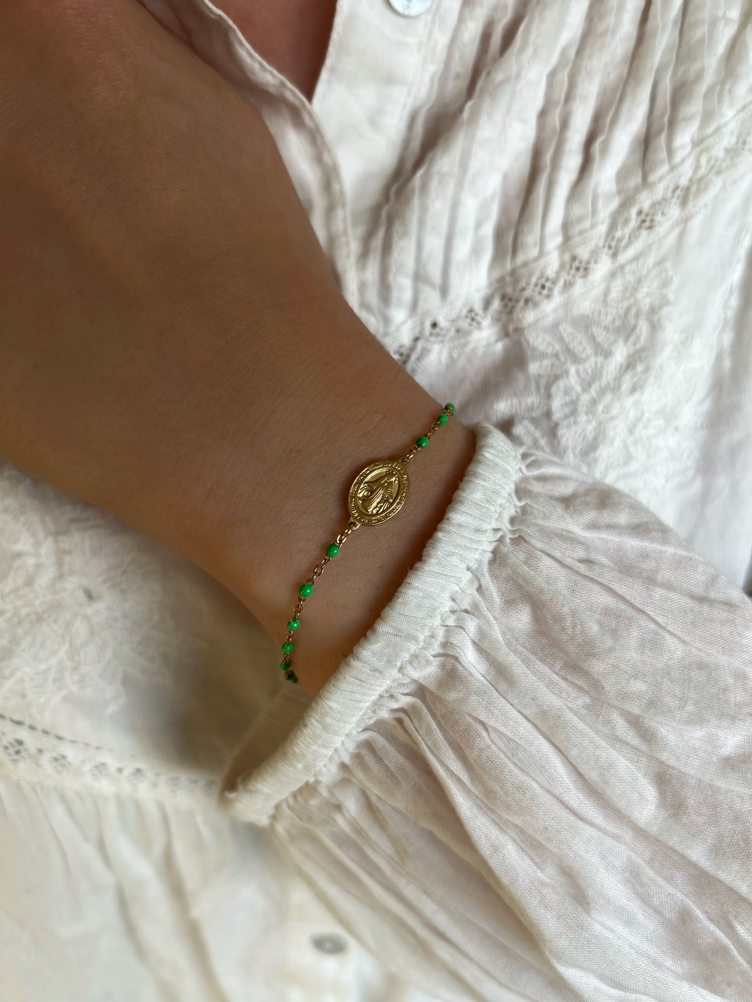 Adjustable bracelet with fine colored beads and a Virgo pendant.