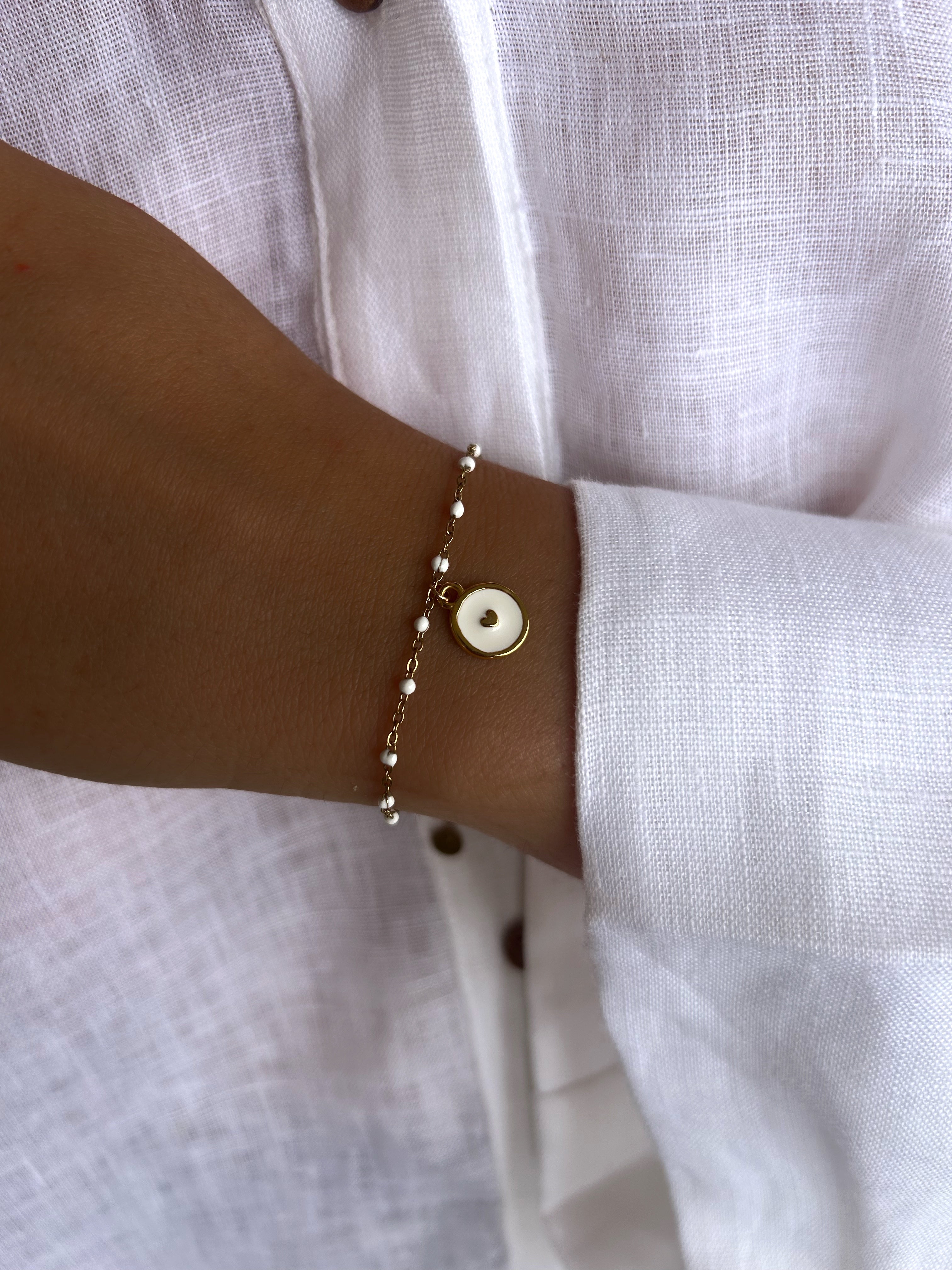Adjustable fine white pearl bracelet with a Payly pendant.