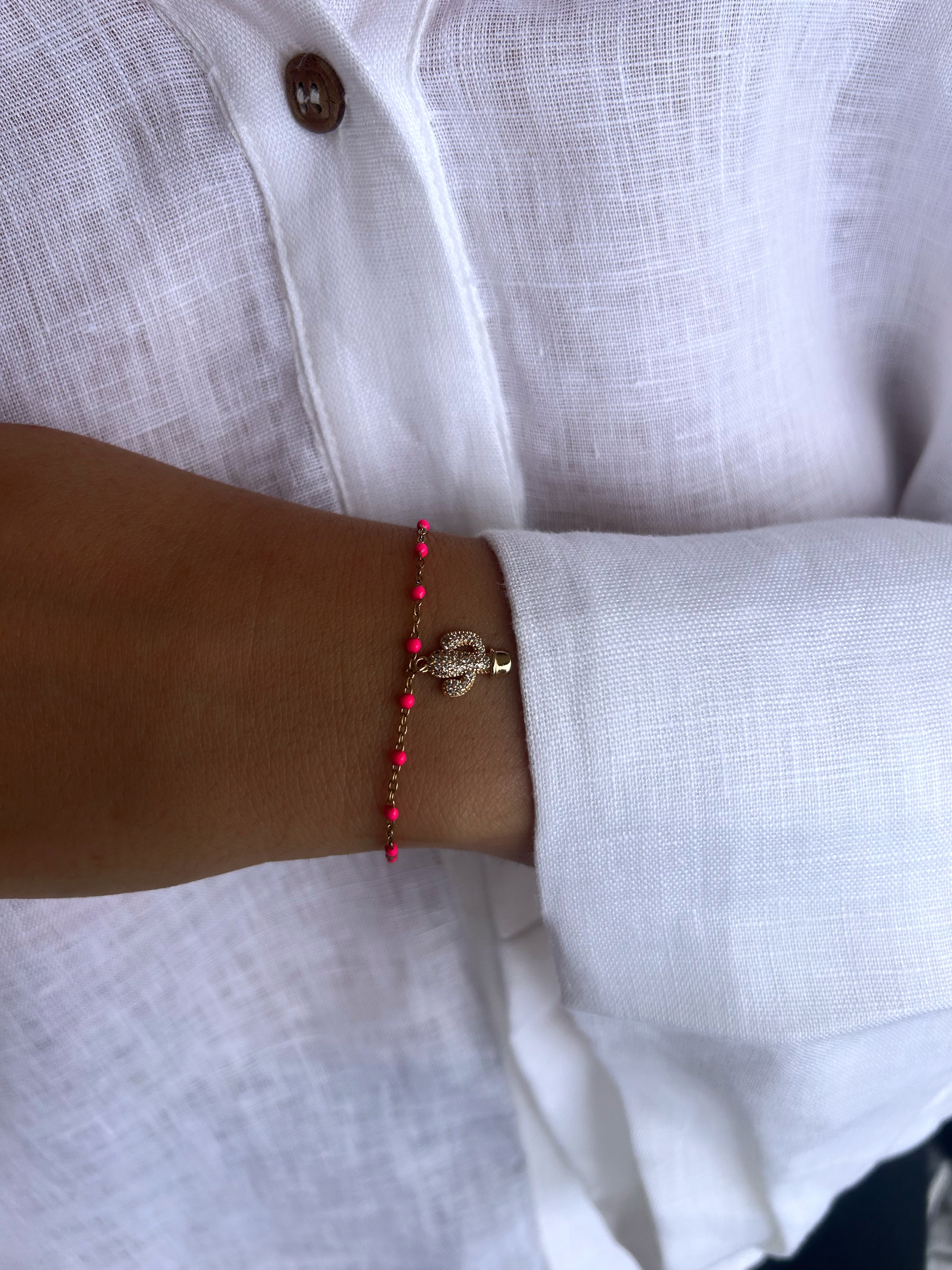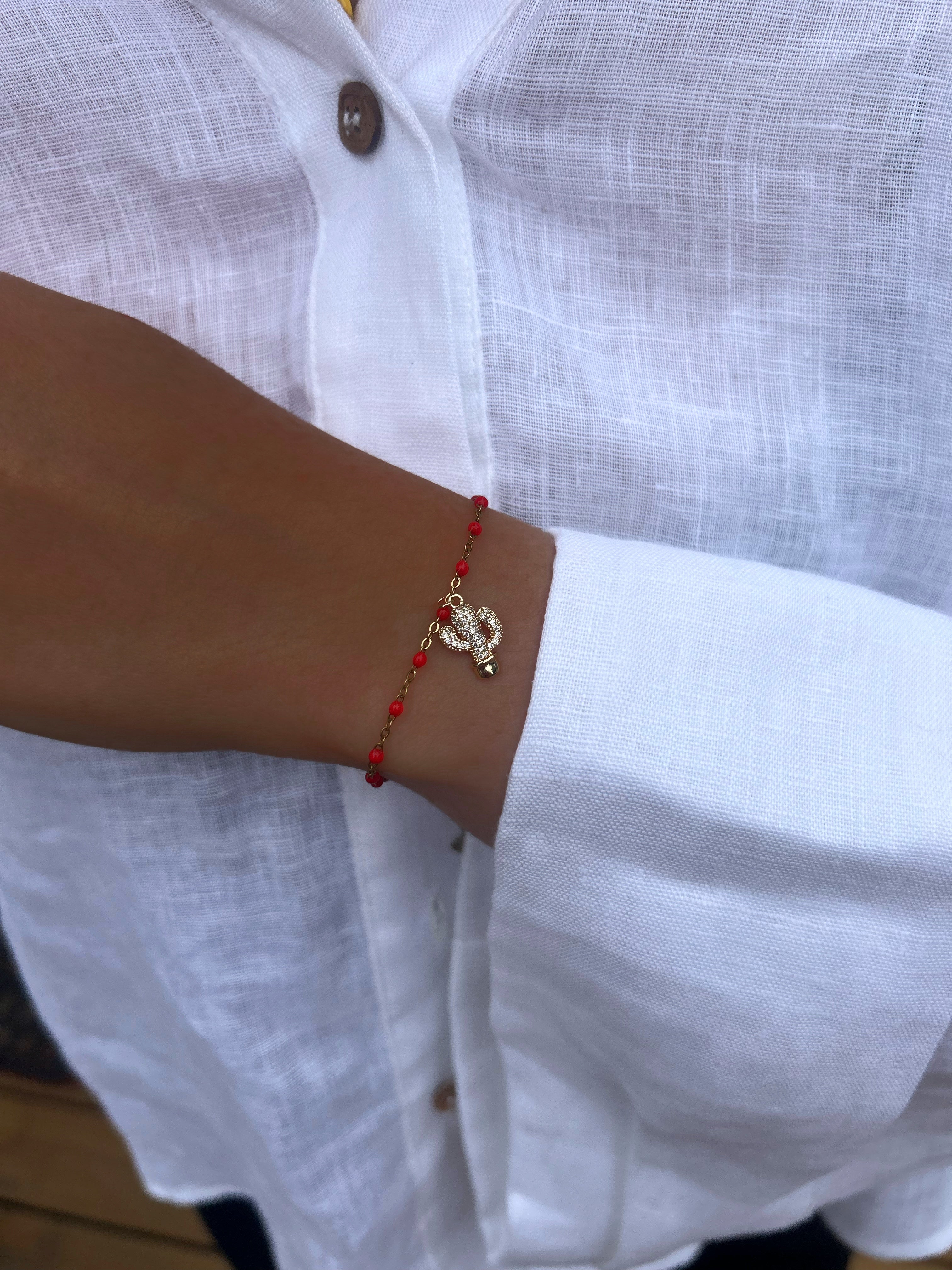 Adjustable bracelet with fine colored beads and a cactus pendant decorated with rhinestones .