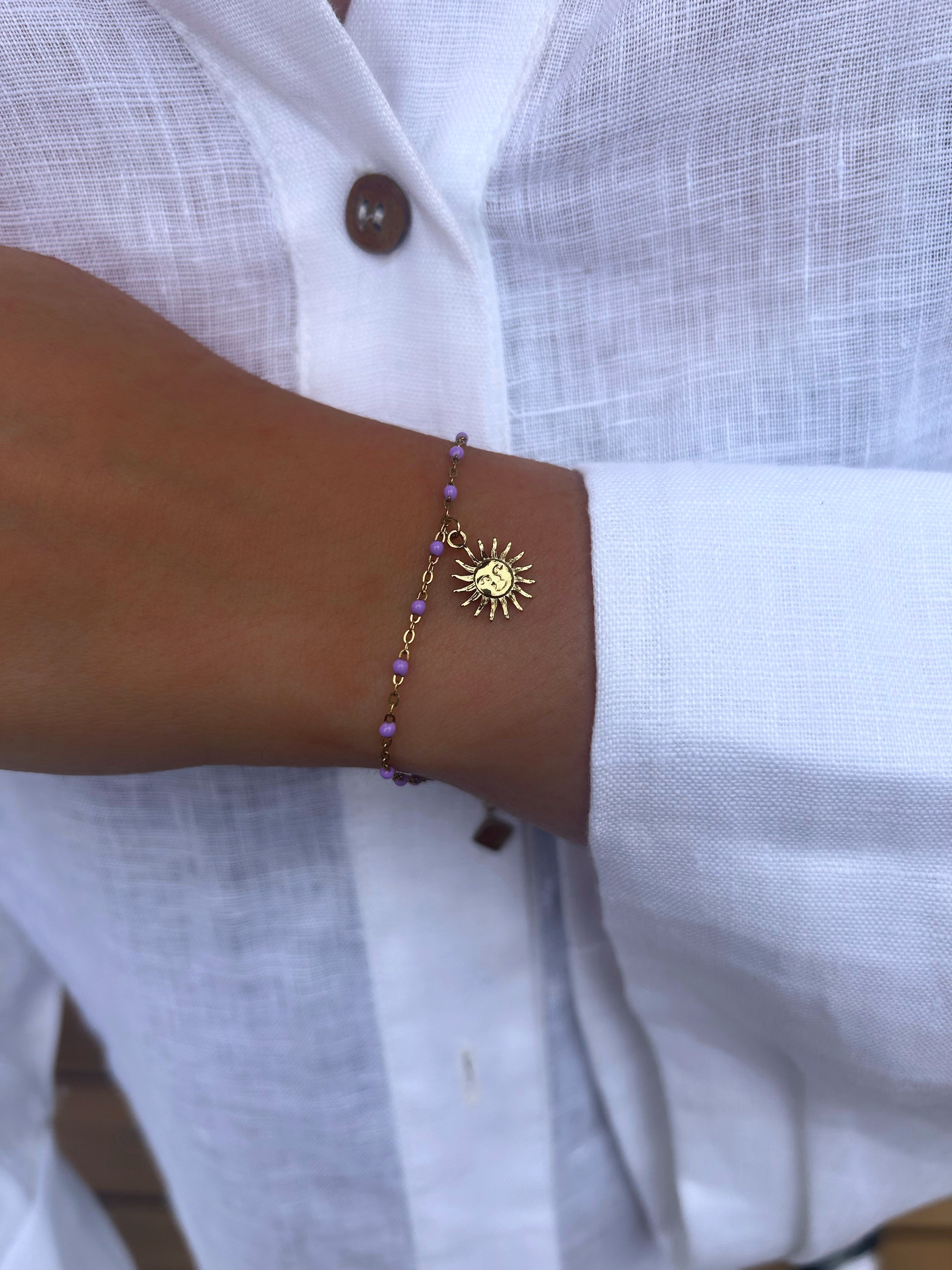Adjustable bracelet with fine colored beads and a sun pendant.