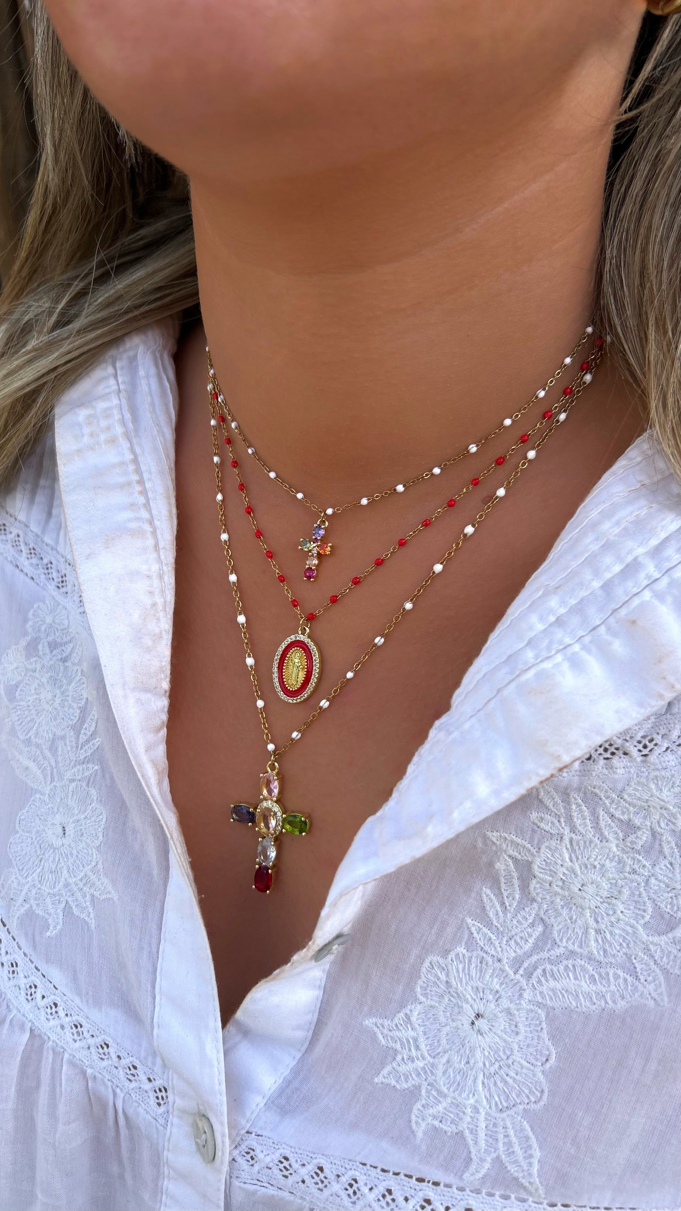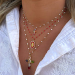 Adjustable necklace with fine colored beads and a Virgin pendant decorated with rhinestones.