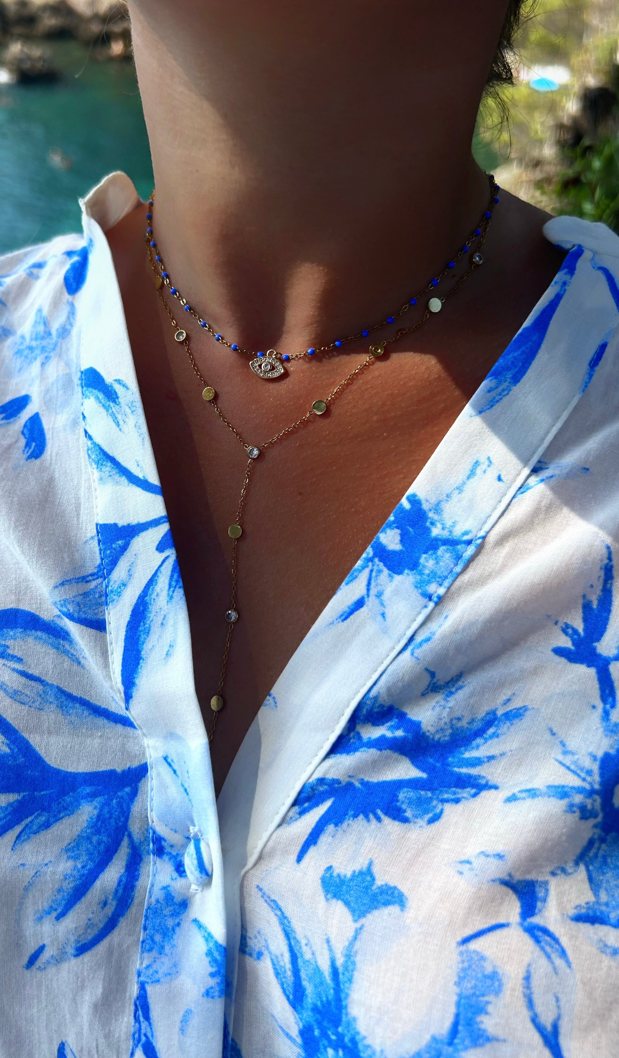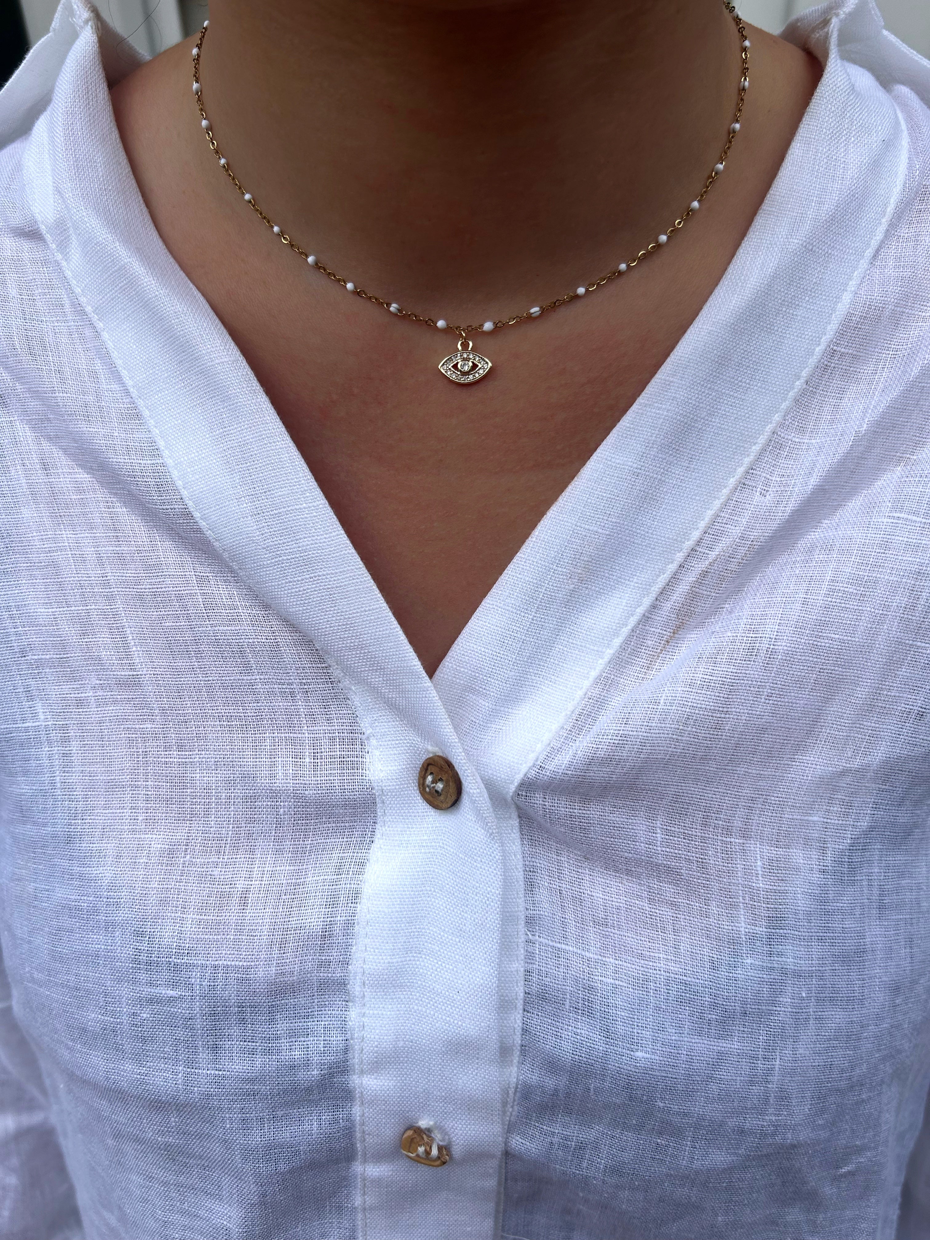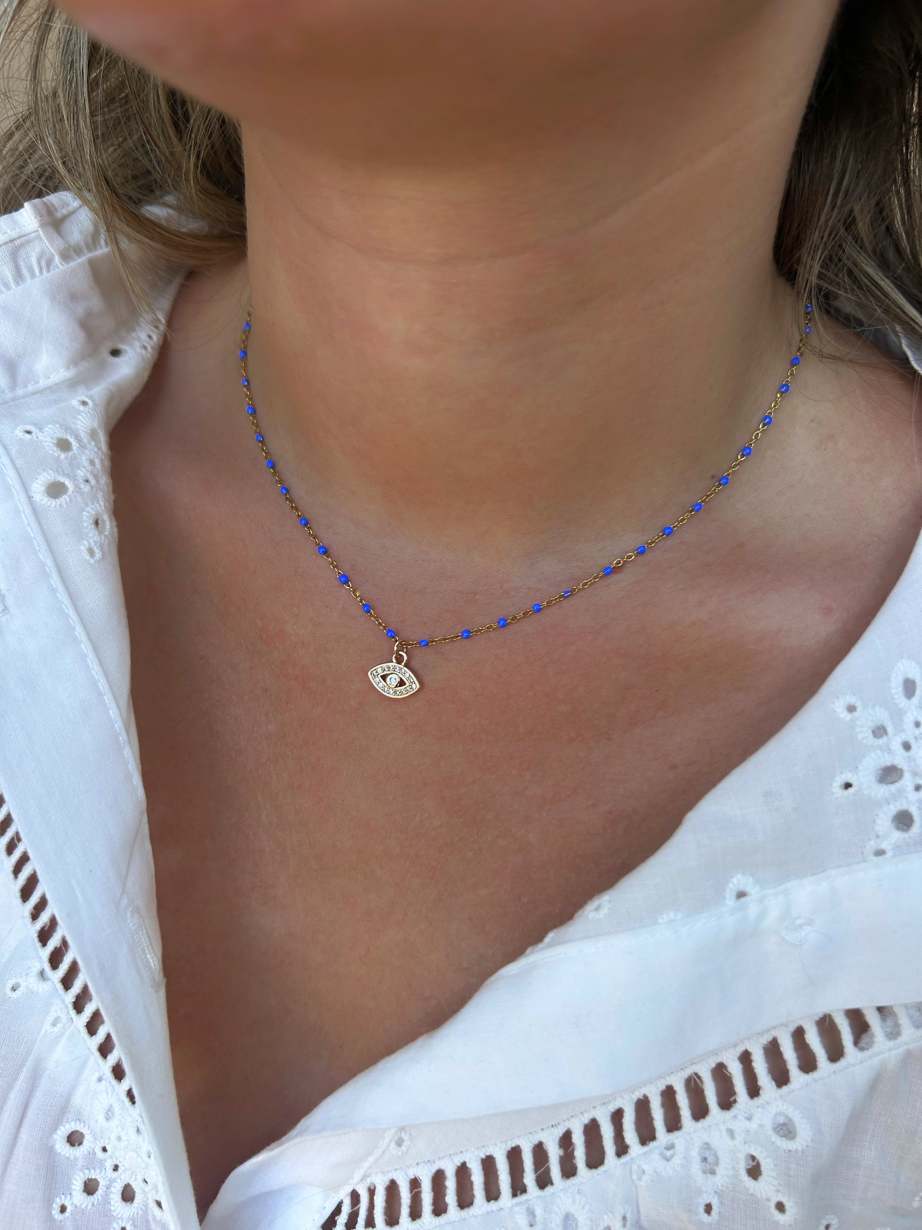 Collar ajustable con finas cuentas de colores y colgante de ojo decorado con pedrería.