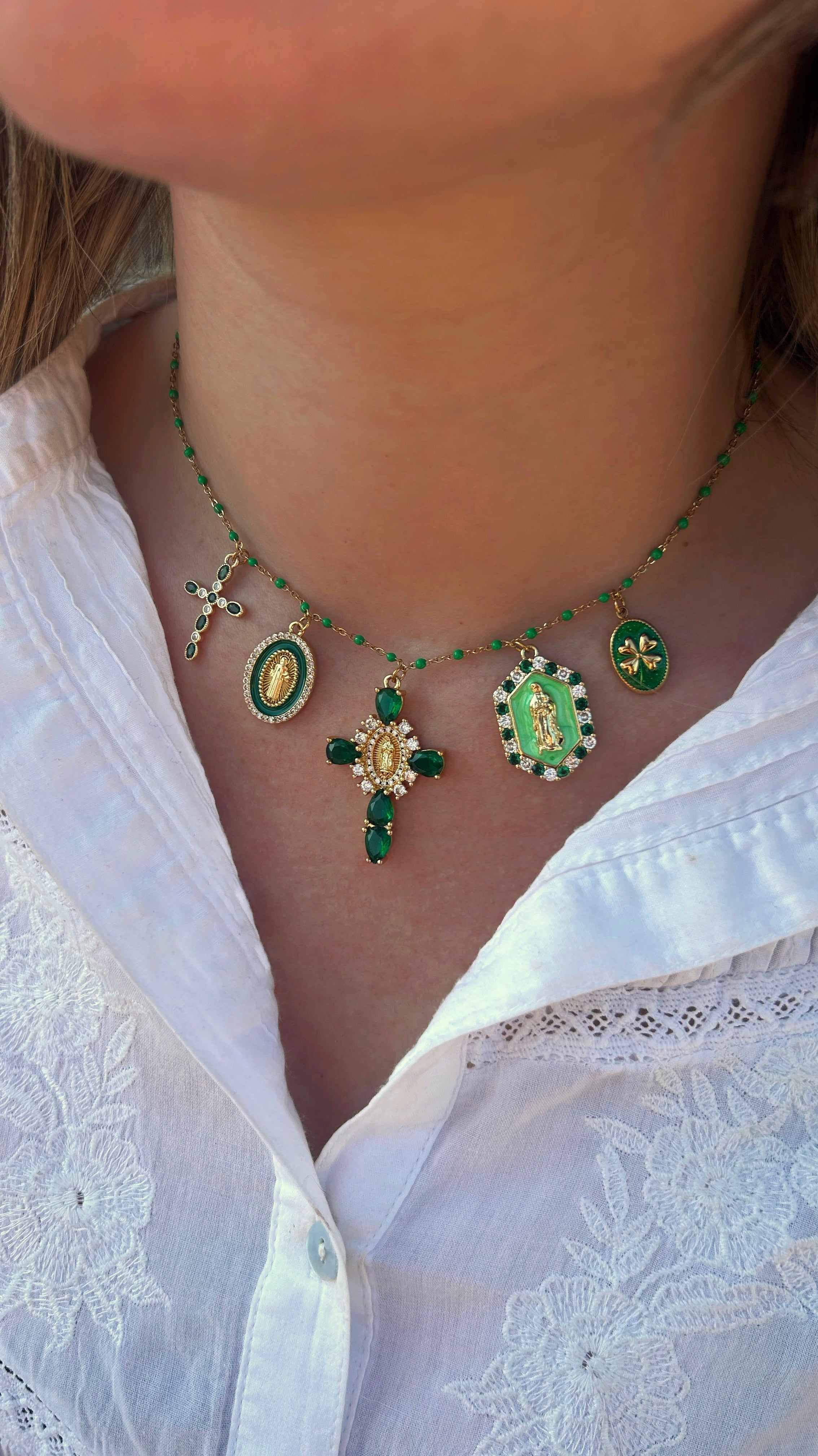 Collier à fines perles vert ajustable, composée de 5 charms de la collection Croyance.