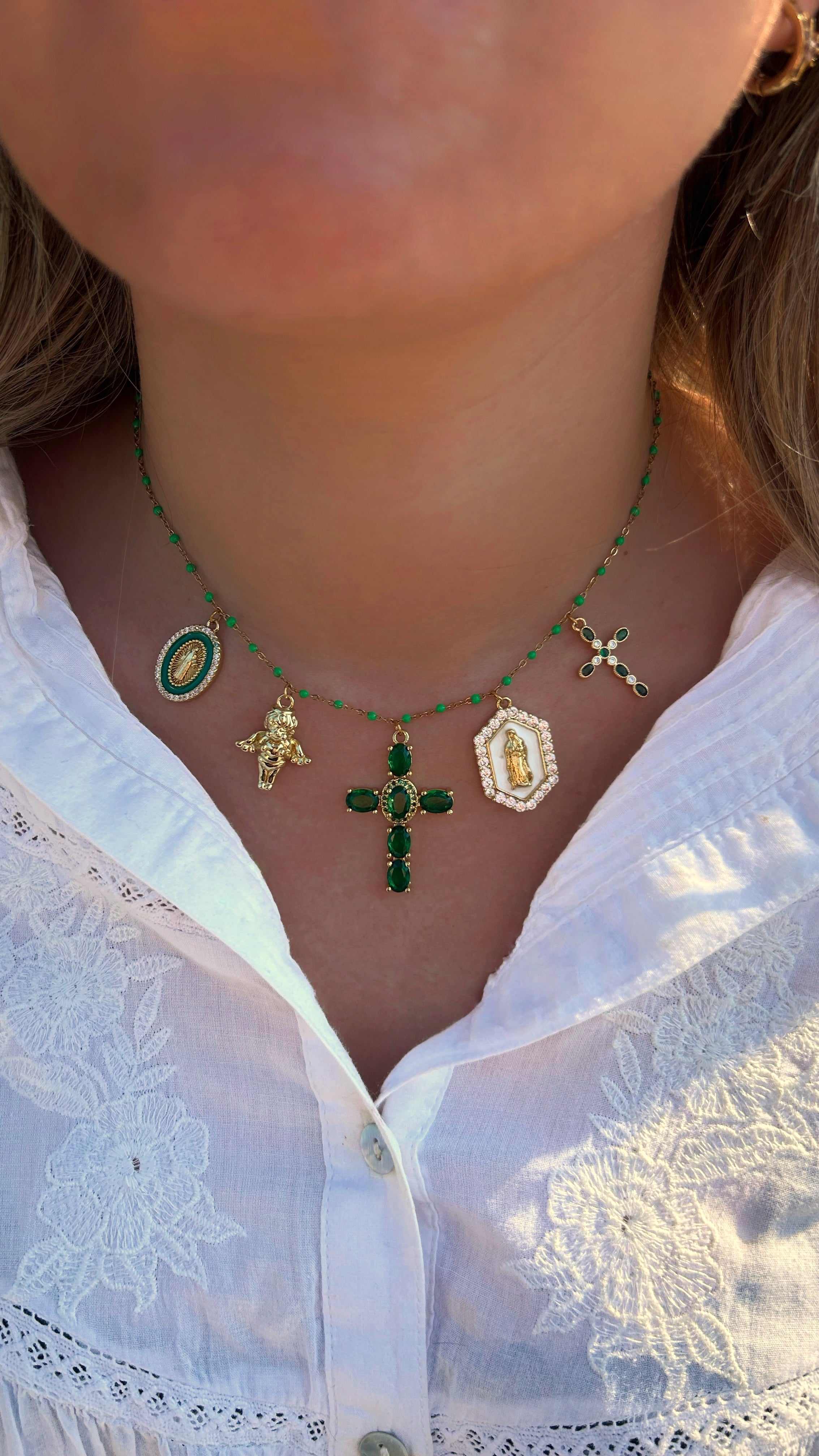 Collier à fines perles verte ajustable, composée de 5 charms de la collection Croyance.