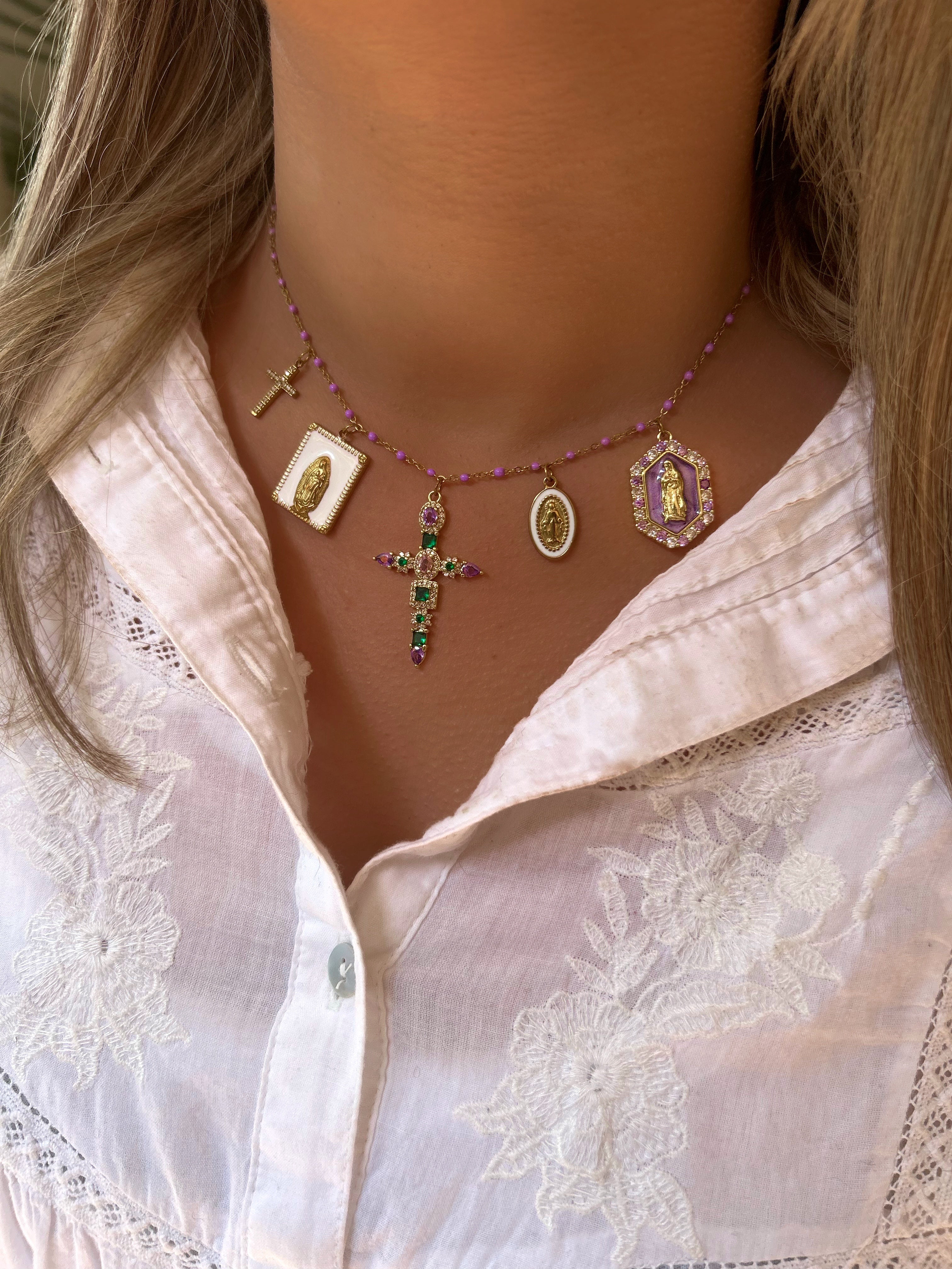 Collar ajustable con finas cuentas de color morado, compuesto por 5 charms de la colección Croyance.