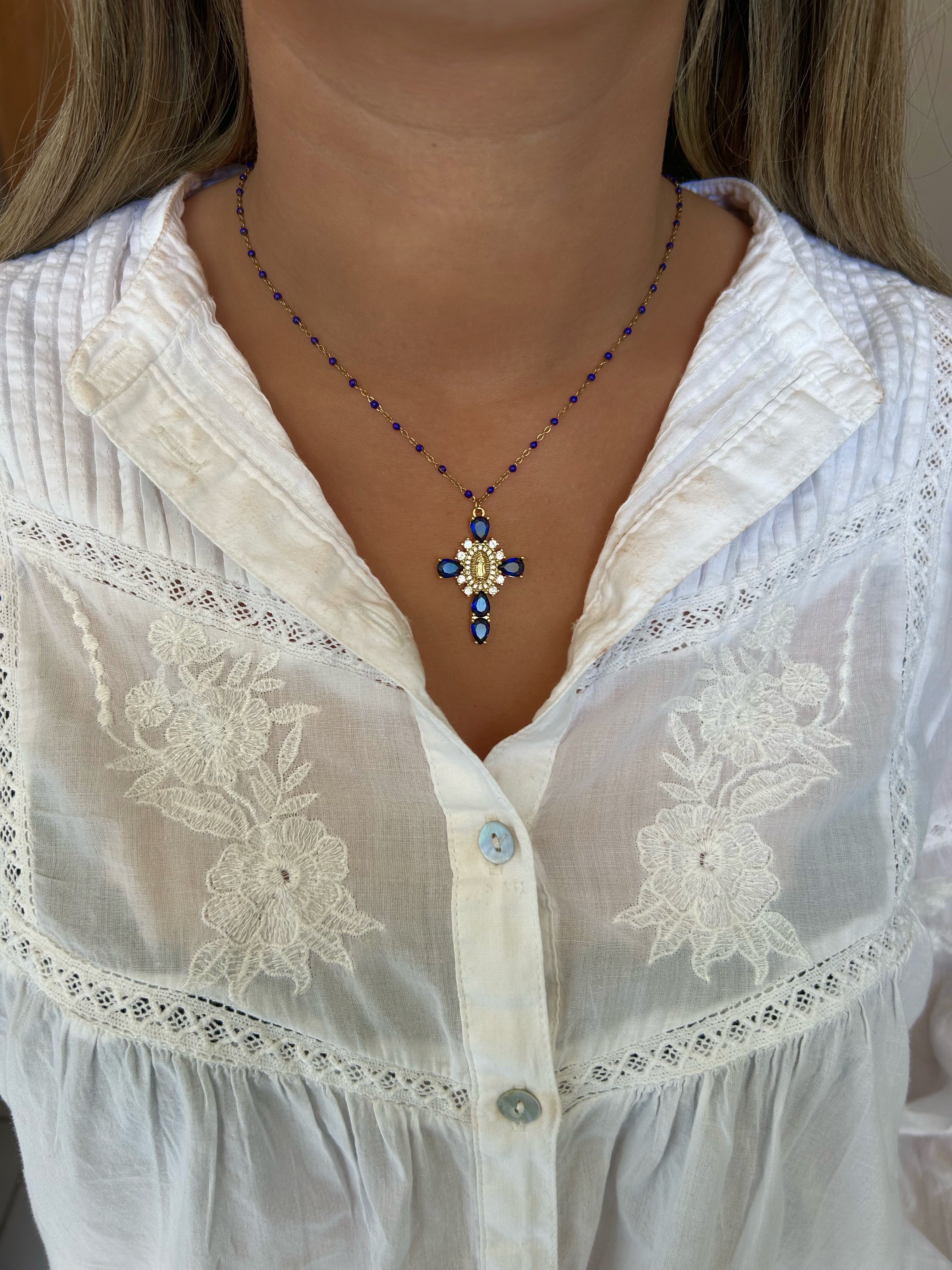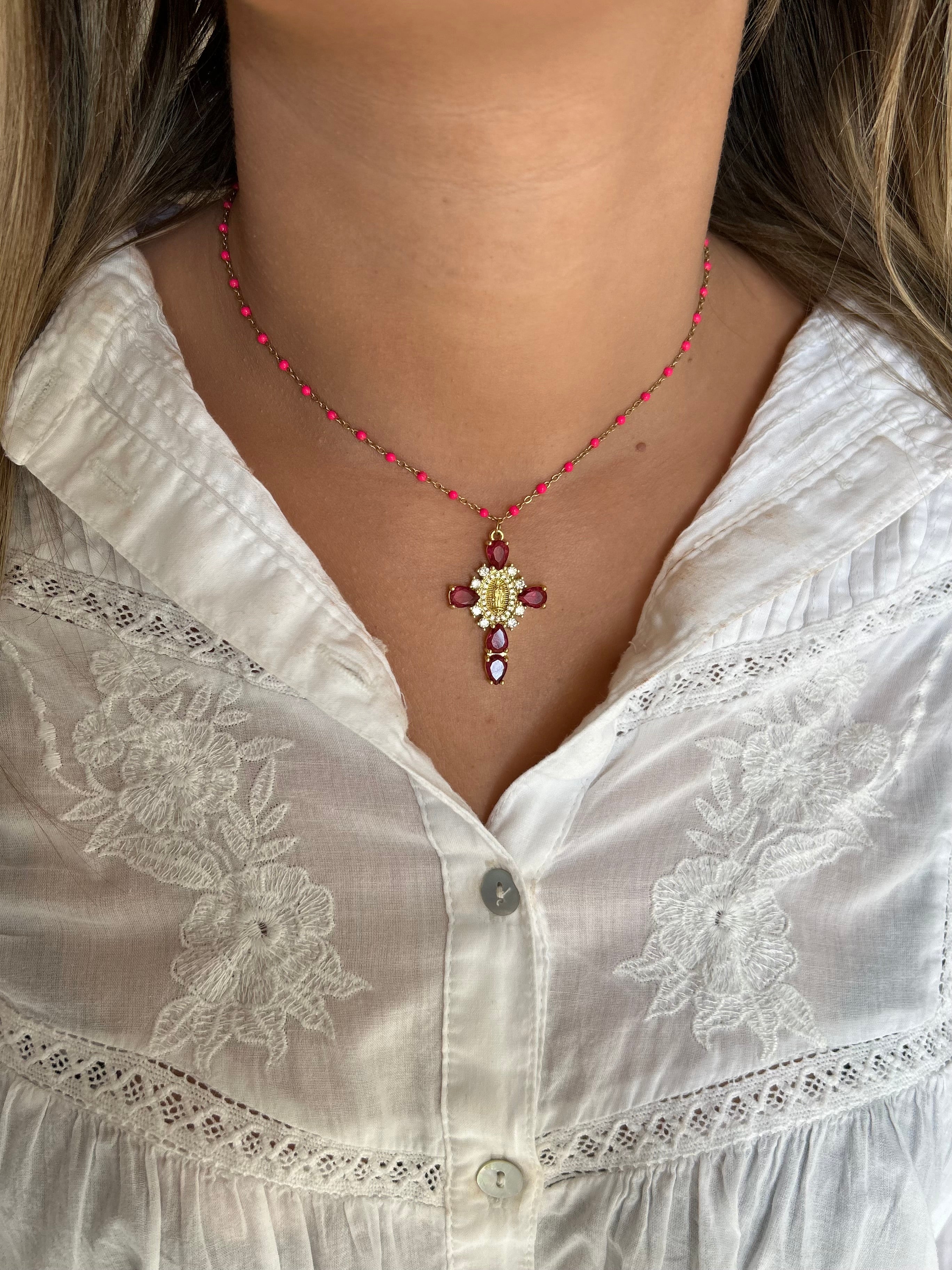 Collar ajustable con finas cuentas de colores y colgante de cruz decorado con pedrería.
