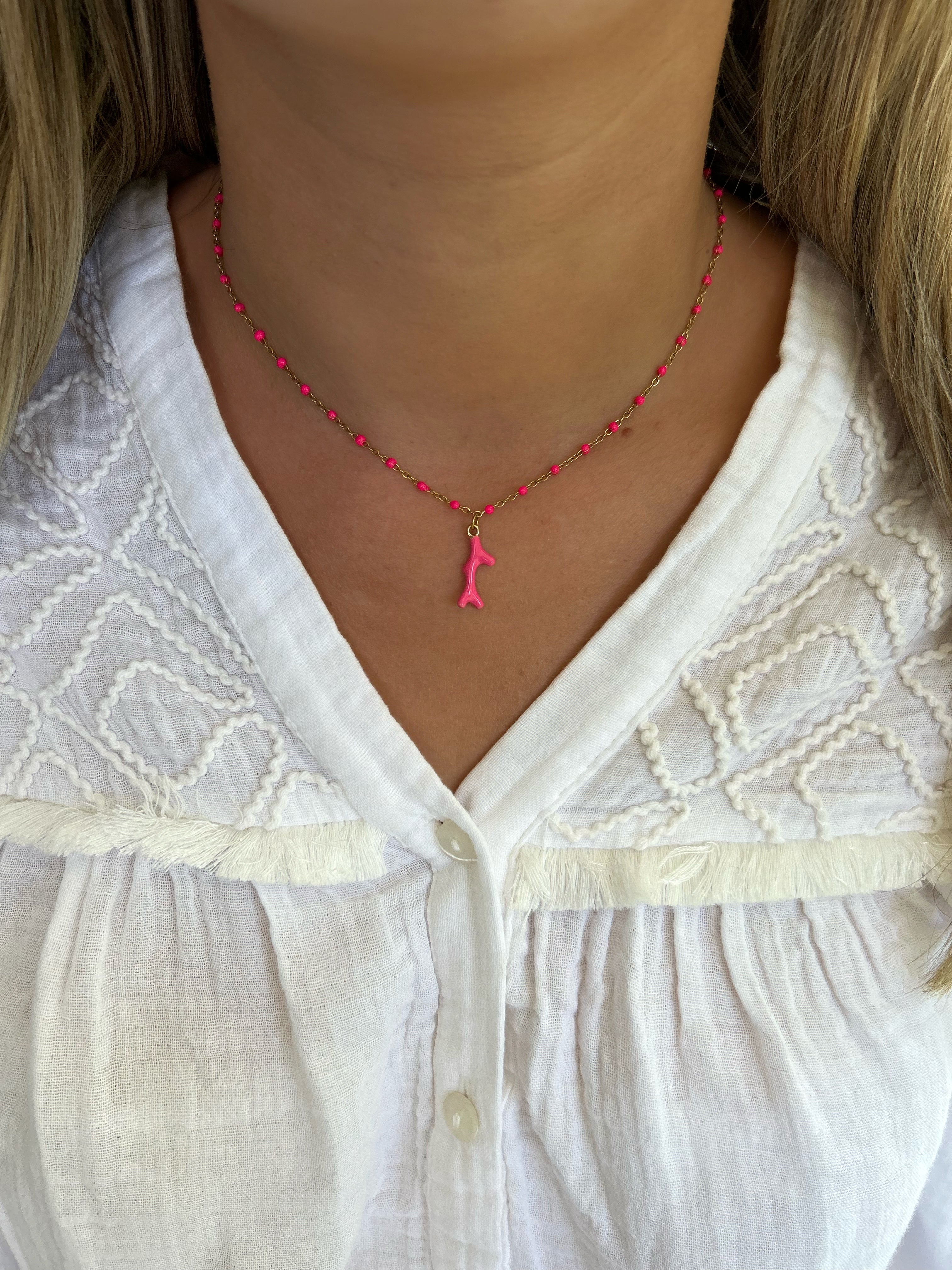 Collar ajustable de perlas finas rosas con colgante de coral.