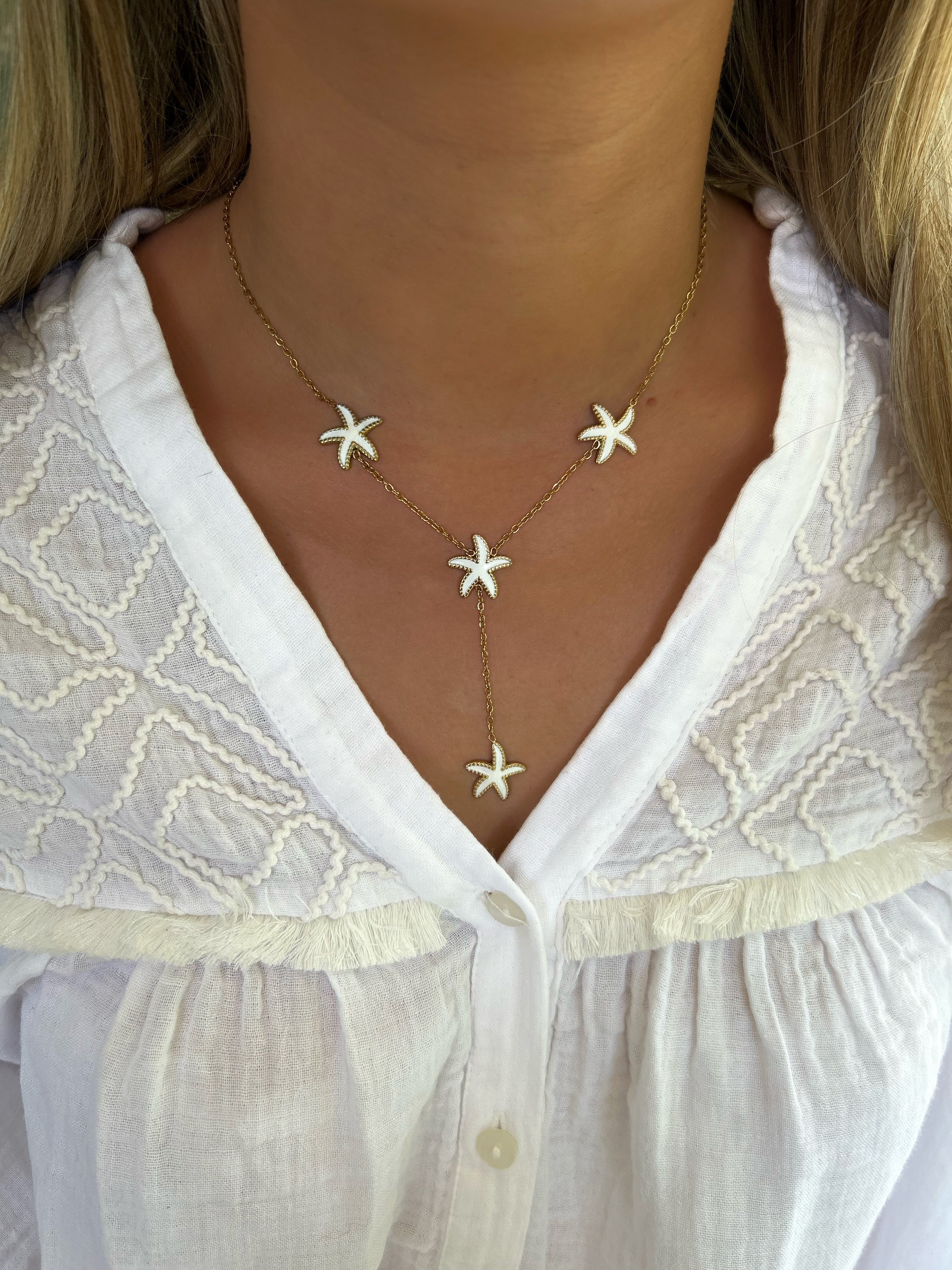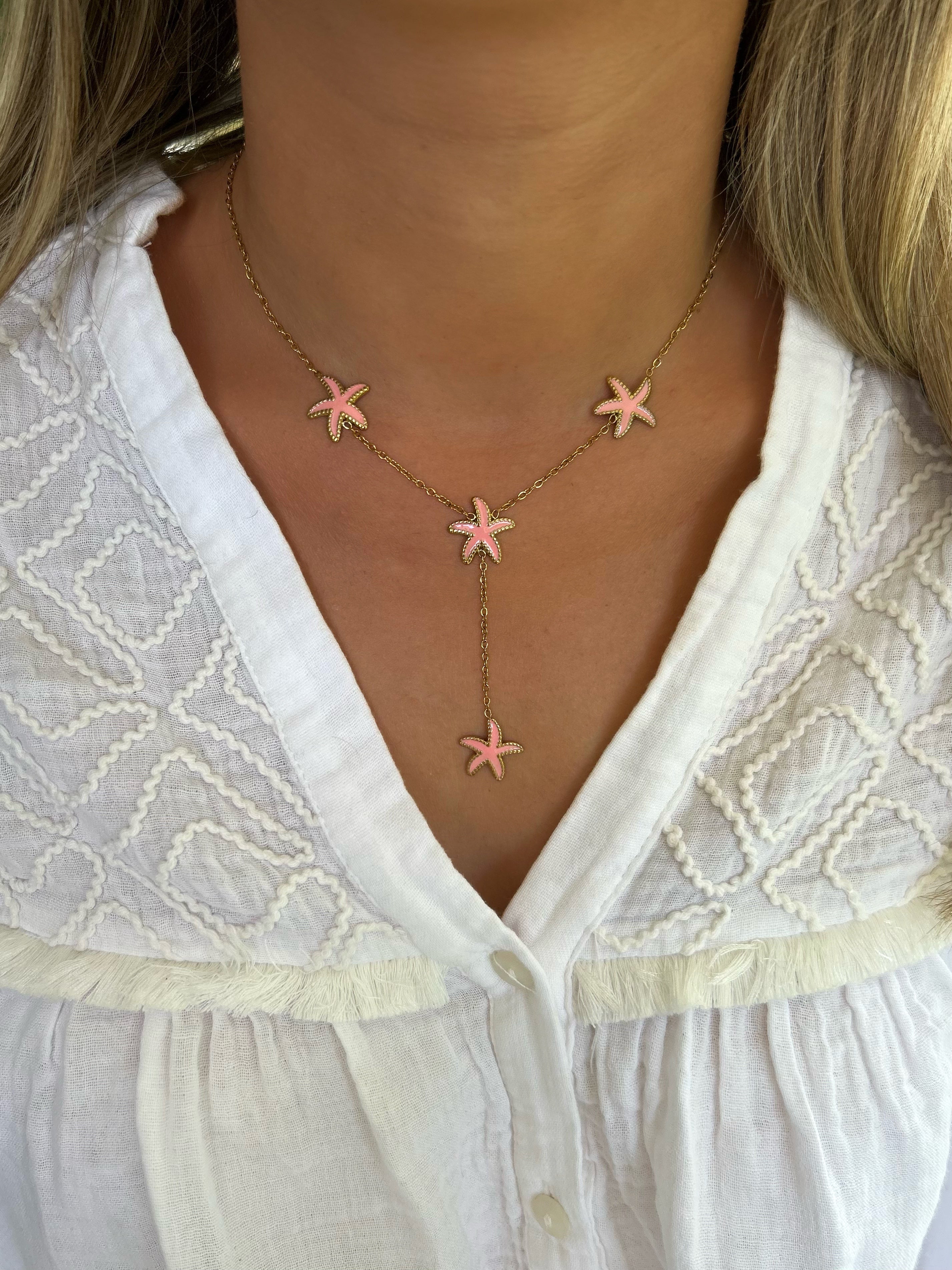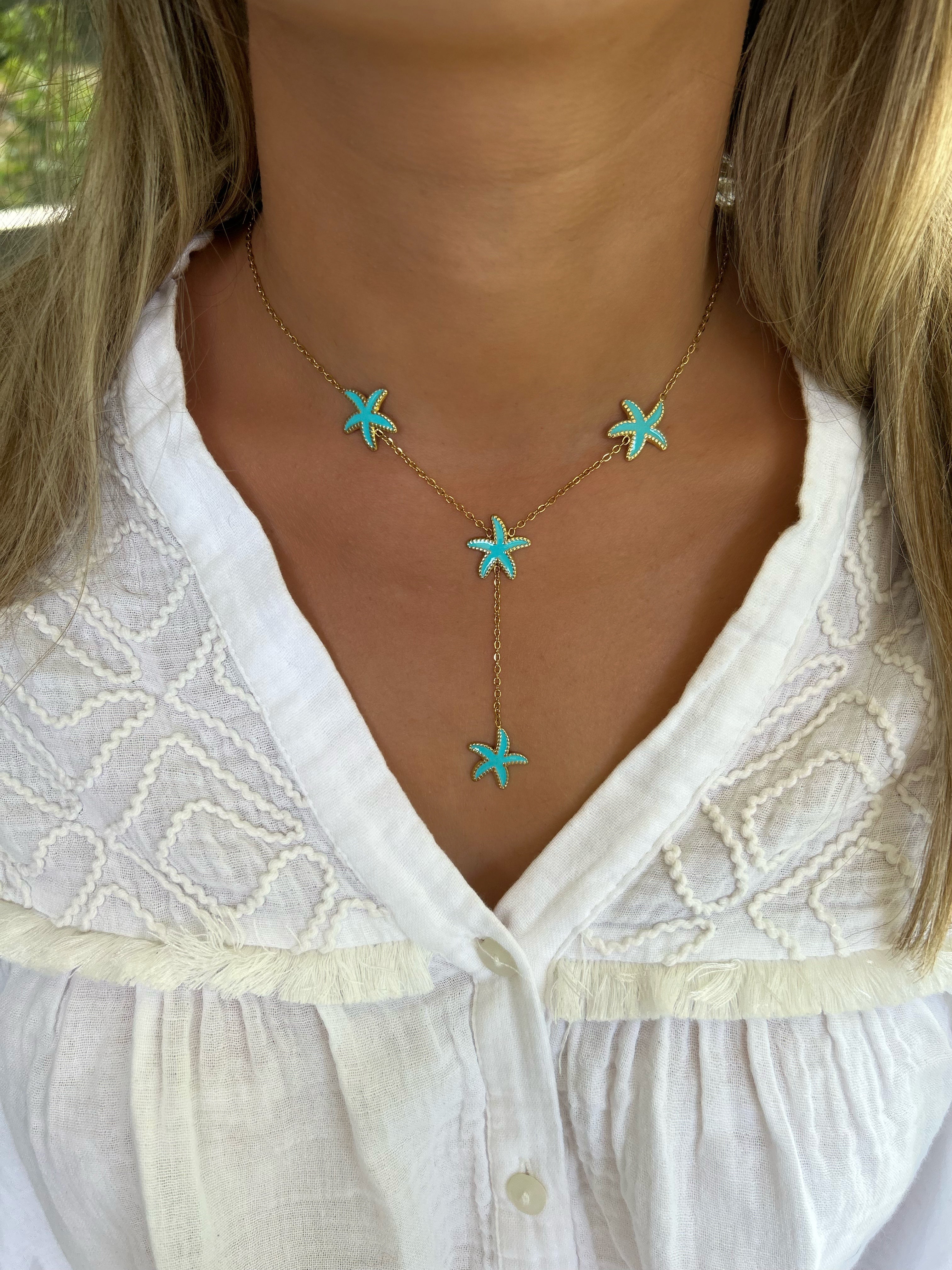 Collar en Y de finas cadenas ajustables con colgantes de estrellas de mar de colores.