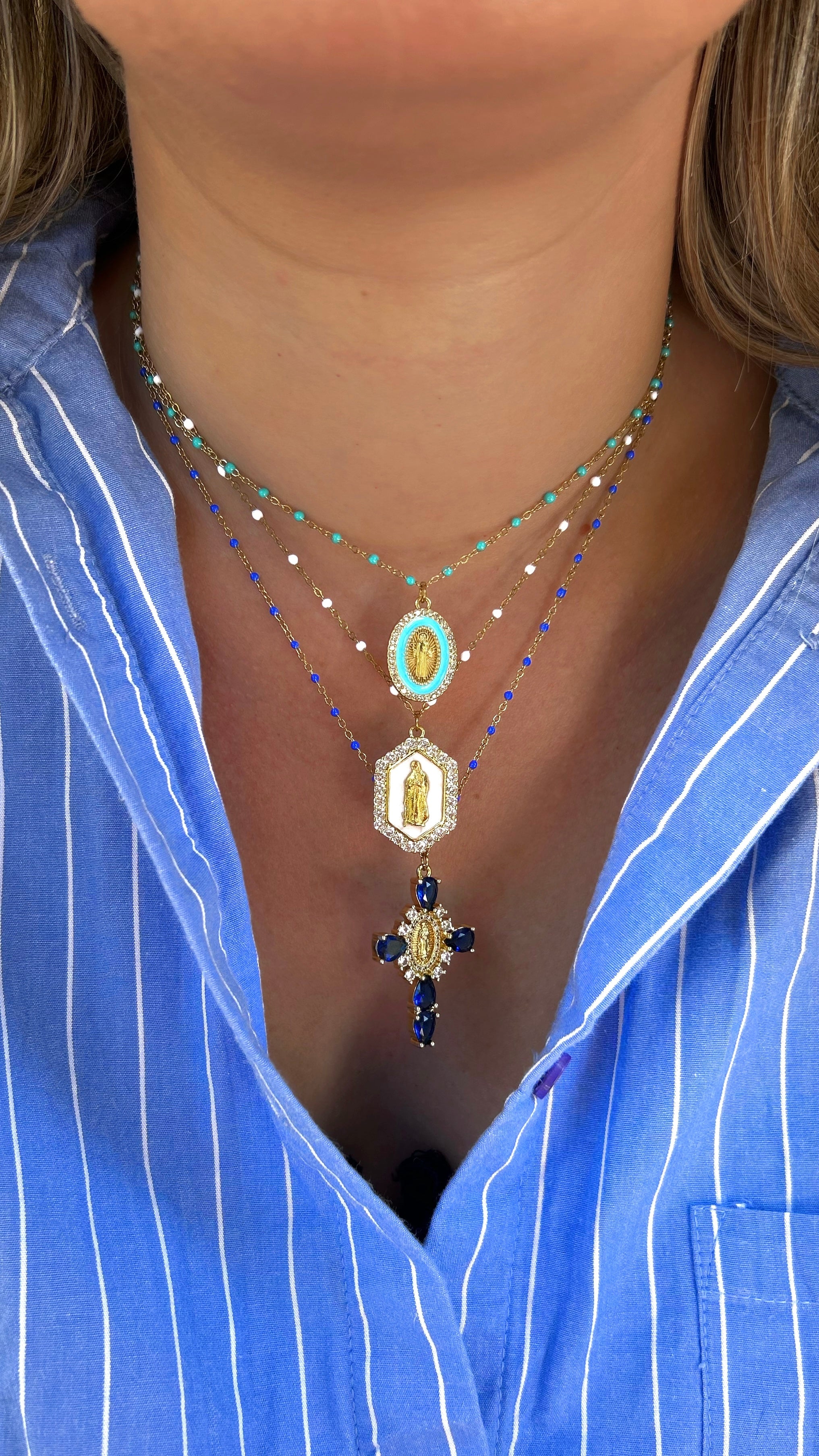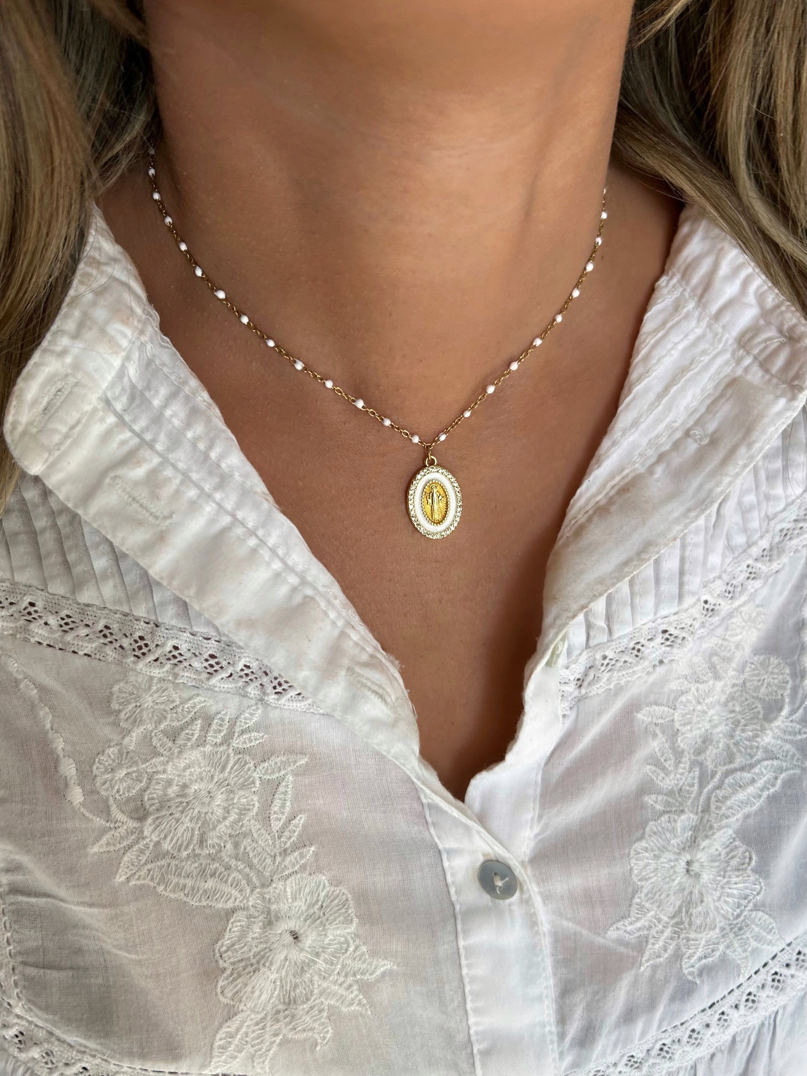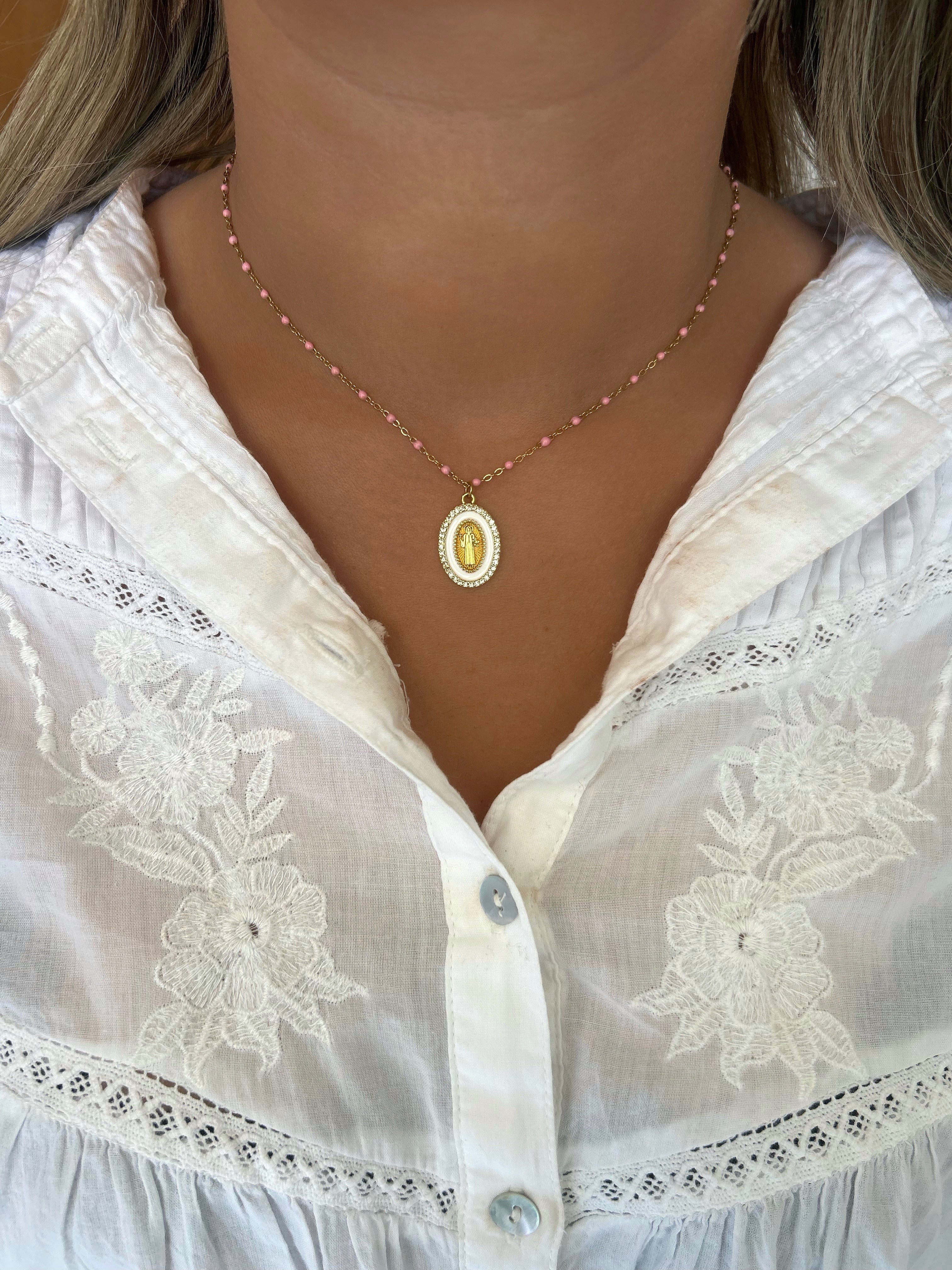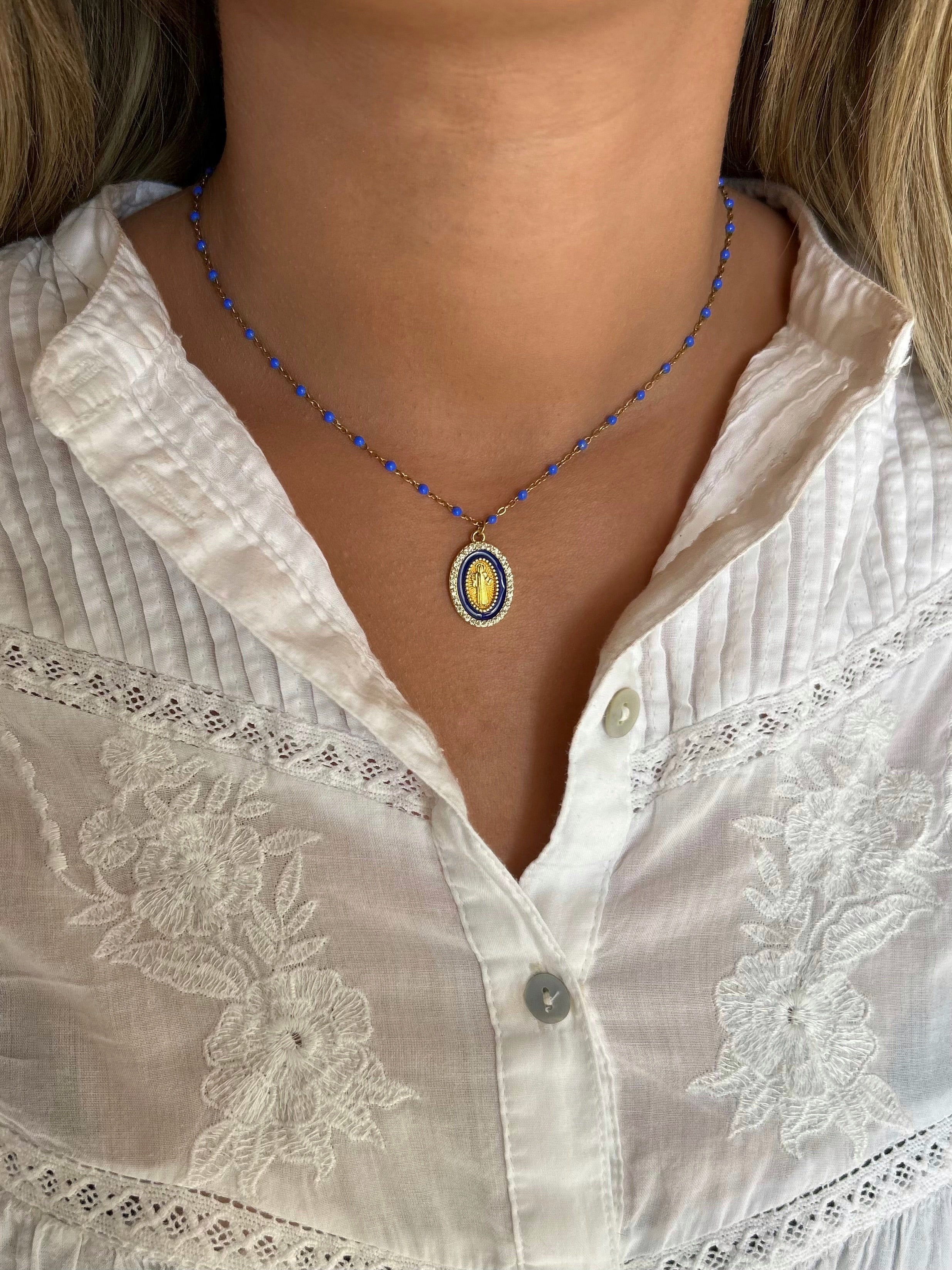 Collar ajustable con finas cuentas de colores y colgante de Virgen decorado con pedrería.